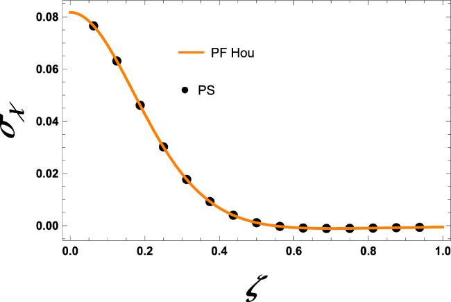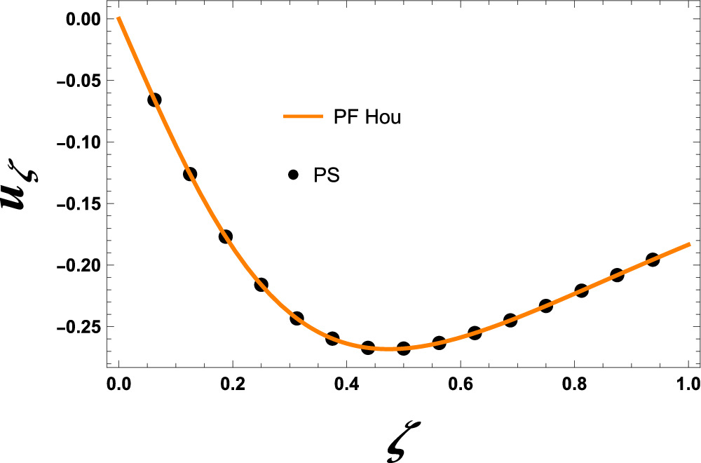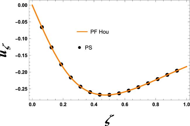 Figure 2. Comparison of the dimensionless displacement component uζ × 1012 with PF Hou at χ = 1. |