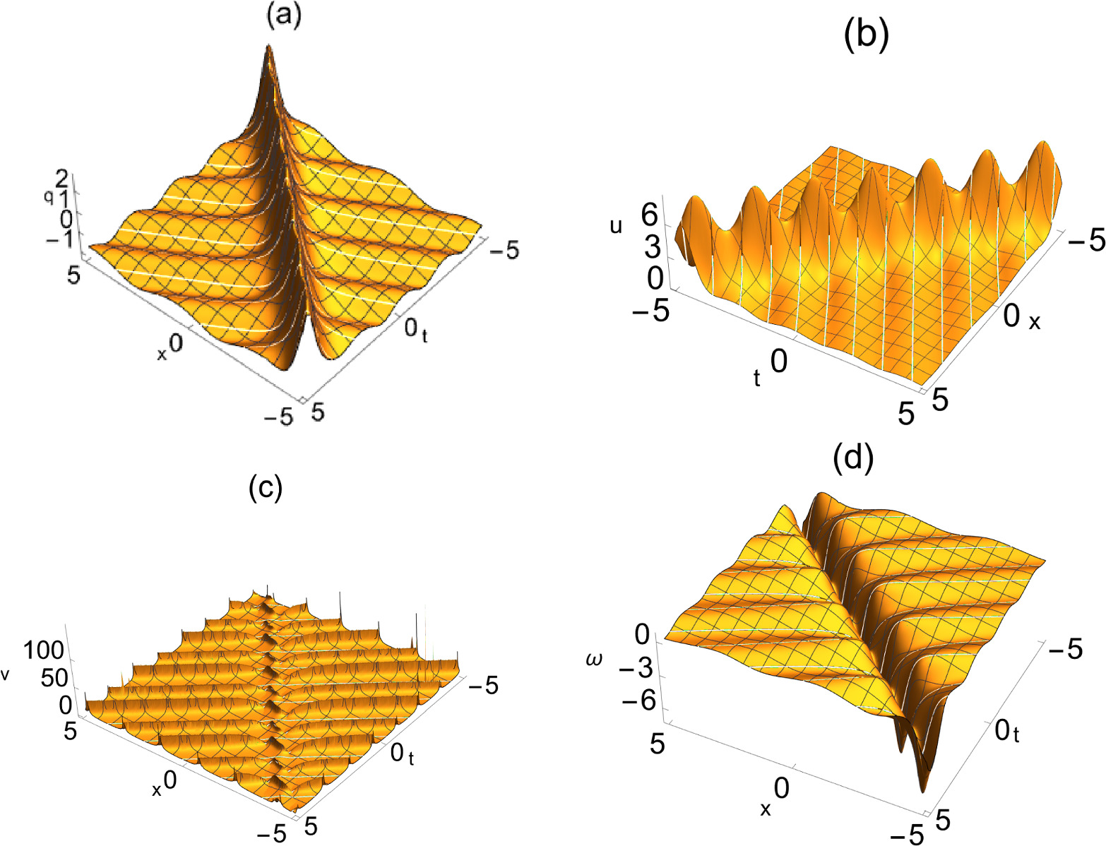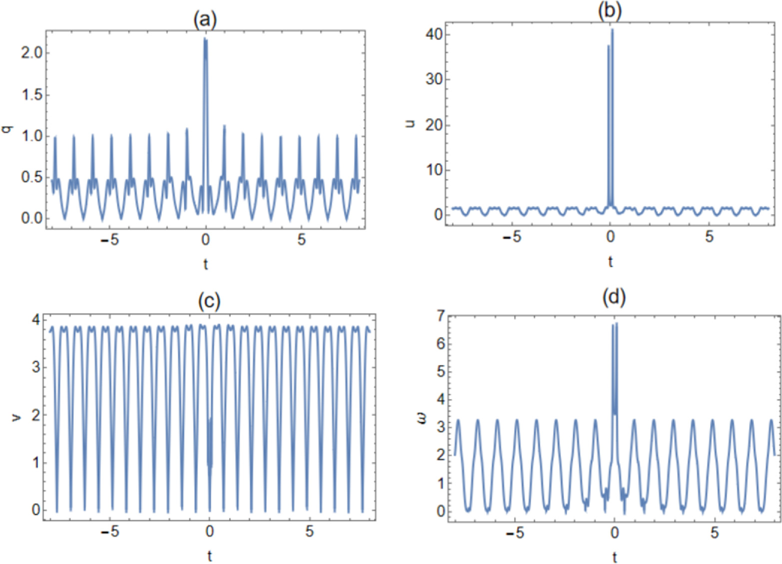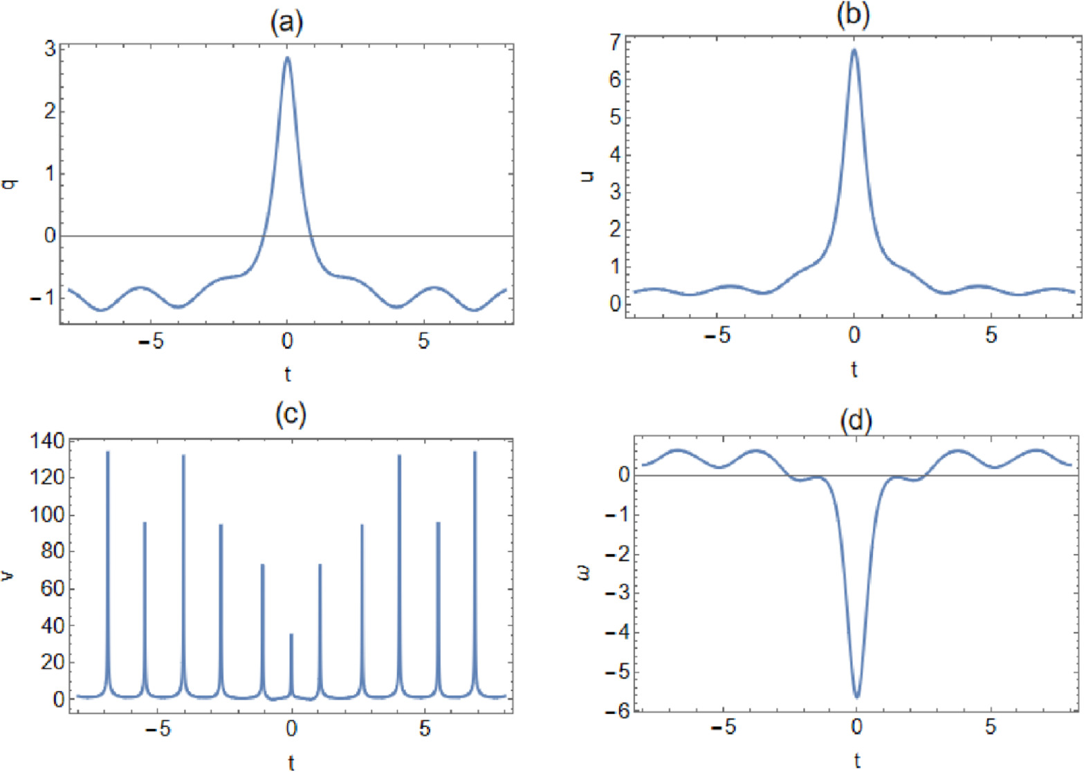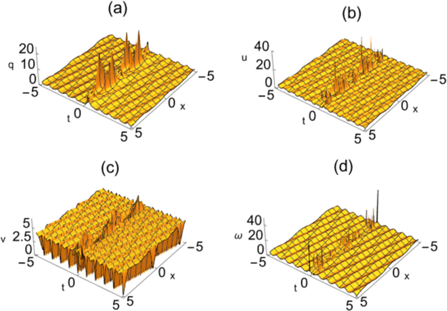 From figures 1 and 3, we can see that the rogue waves on the dn-periodic background of the reduced Maxwell–Bloch system are mainly linear rogue waves. Figures 1 and 3 illustrate the rogue dn-periodic waves with k = 0.5 and k = 0.65, respectively. From figures 2 and 4, it can be seen that, except for when the amplitude of the rogue periodic wave when v, ω = 0.5 and v, ω = 0.65 reaches the minimum value at the origin, the amplitude of the other rogue periodic waves reaches the maximum value at the origin. It can be obtained from two-dimensional figures 2 and 4, with the increase of the elliptic modulus k, the amplitude of the periodic background wave of the v is greatly reduced from 134.1 to 65.4, but the amplitude of the periodic background wave of q, u and ω increases. where the amplitude of the periodic background wave of q increases from − 0.69 to − 0.57, u increases from 0.48 to 0.5 and ω increases from 0.64 to 0.67. Therefore, the amplitude of the periodic background wave of the other potentials increases with the increase of k, except that v decreases greatly with the increase of k. That is to say, the periodic background wave amplitudes of the four potentials are regular. Moreover, from figures 2 and 4, we can see that the amplitudes of the rogue periodic waves of the four potentials are different.