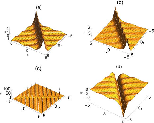 where q(x, t), u(x, t), v(x, t), ω(x, t) are complex differentiable functions, and the subscripts denote the partial derivatives with respect to the scaled space variable x and time variable t. μ is an arbitrary constant. The reduced Maxwell-Bloch system has been studied for the N-fold Darboux transformation and soliton solutions [32]. The Darboux transformation has been proposed for finding the soliton solutions [8, 33]. The generalized Darboux transformation, which can be iterated with the same spectral parameter, has been developed to construct high-order rogue wave solutions and multi-pole soliton solutions [34, 35]. Other ways for solving nonlinear systems have been developed, such as the binary Darboux transformation [36], the Hirota method [37–43], and the Pfaffian technique [44].