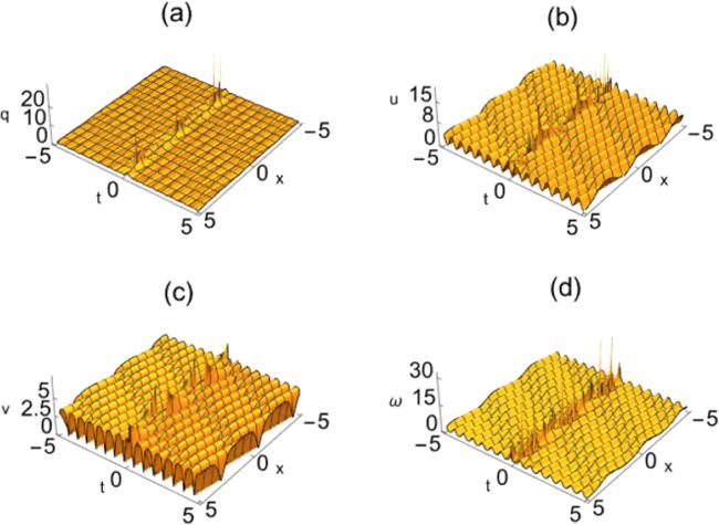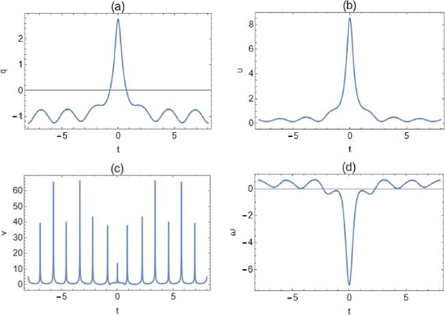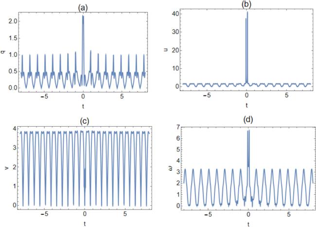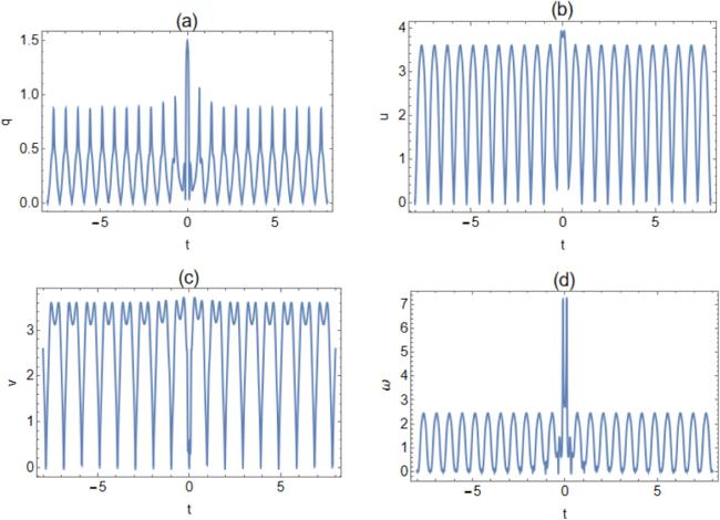 Figures 5 and 7 illustrate the rogue cn-periodic waves for k = 0.5 and k = 0.65. From figure 6 and 8, it can be seen that except for the amplitude of the rogue periodic wave when v = 0.5 and v = 0.65 reaches the minimum value at the origin, the amplitude of the other rogue periodic waves reaches the maximum value at the origin. The corresponding two-dimensional plots are presented in figures 6 and 8. As the elliptic modulus k increases, the amplitude of the periodic background wave of q decreases from 1.01 to 0.98, u decreases from 3.52 to 1.7, v increases from 3.6 to 3.82 and ω increases from 2.43 to 3.27. With the increase of k, the amplitude of the periodic background waves of q and u decreases, and the amplitude of v and ω increases, so the amplitude of the periodic background wave of the four potentials is regular.