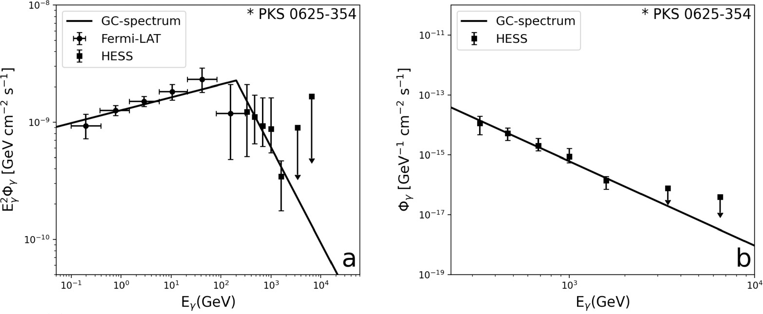 However, the traditional hadronic scenario cannot fit the observed VHE spectrum. Next there was a general preference for the lepton scenario. The PKS 0625-354 broad-band spectral energy distribution shows two humps that can be interpreted as synchrotron-self-Compton (SSC) emission products. However, a careful review of the lepton program is not satisfactory. The VHE spectra cannot be described by a single-region SSC scheme. After modification of multiple sources in the low-energy region, different models, the multi-zone SSC scheme and the lepton-hadron SSC scheme can give similar results, suggesting that the correlation between the two peaks is not necessarily inevitable, and that this is a key point in determining whether or not SSC is the radiation mechanism. Figure 4 is the condensation-spectrum of PKS 0625-354 using equation (8). It can be found a specific spectrum with sharp broken power law at 200 GeV as shown by the condensation spectrum. The data is corrected for EBL attenuation. In order to test the PL of Φγ predicted by pion condensation, figure 3(b) was not multiplied by ${E}_{\gamma }^{2}$ and we use Chi-square per degree of freedom (χ2/d. o. f. ) to assess the fitting goodness.