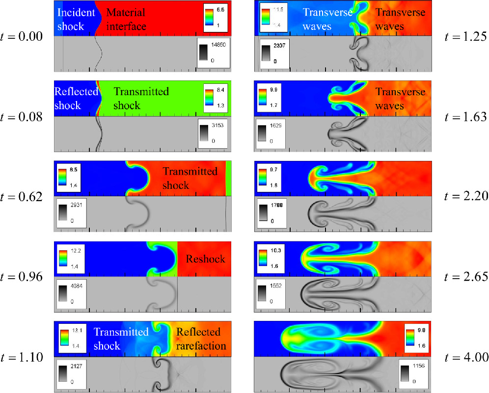 To provide a clear understanding of the evolution of the RM instability, figure 3 presents the density contours and Schlieren images at various moments for a relaxation parameter of θσ = 2.0 × 10−5. The upper portion of each subplot displays the density contours, while the lower portion show the Schlieren images of density. At the initial time, the incident shock wave begins propagating rightwards and rapidly crosses the material interface at t = 0.08. This interaction produces a transmitted shock wave propagating through component B, and a reflected shock wave bouncing off the interface. At this stage, the amplitude of the disturbance at the interface gradually grows, although the deformation remains minimal. Subsequently, the two materials on either side of the interface begin to mix. The lighter fluid penetrates the heavier fluid, then a bubble and spike begin to form. Later, the transmitted shock wave reaches the right boundary and reflects back as a reshock wave propagating leftwards through the flow field. At t = 0.96, the reshock wave interacts with the material interface, triggering a secondary RM instability. During this interaction, the reshock wave propagates from the denser fluid into the lighter fluid, suppressing the growth of bubbles. Simultaneously, a reflected rarefaction wave and a transmitted shock wave are generated. The reflected rarefaction wave interacts with the denser fluid, creating a complex wave pattern resembling a ‘grid’ structure due to the superposition and interference of disturbances propagating in various directions. Meanwhile, the transmitted shock wave continues moving leftwards into the lighter fluid. At t = 1.26, the transmitted shock wave exits the fluid domain. The reverse acceleration induces further deformation at the material interface, generating transverse waves on both sides of the interface. This deformation exemplifies the typical nonlinear behavior of RM instability driven by reflected shock waves. With sustained reverse acceleration, the heavy fluid intrudes into the light fluid, causing the peak structures to elongate in the x-direction. Over time, velocity shear at the interface generates numerous small-scale vortex structures. These vortices subsequently merge into larger vortices, enhancing the mixing process. Eventually, as the two fluids become fully blended, the vortices dissipate, and the interface becomes indistinct. These simulation results qualitatively agree with previous studies [75]. Furthermore, the Schlieren images clearly capture the propagation trajectory of the shock wave, intuitively illustrating the growth direction of interface perturbations and the distribution of velocity shear. These images also highlight the formation of vortex structures during the evolution process. As the system evolves, the Schlieren images reveal the gradual decay of these vortices, which eventually disappear at later stages.