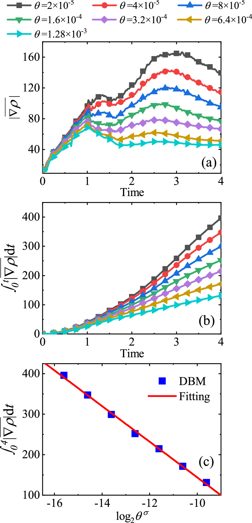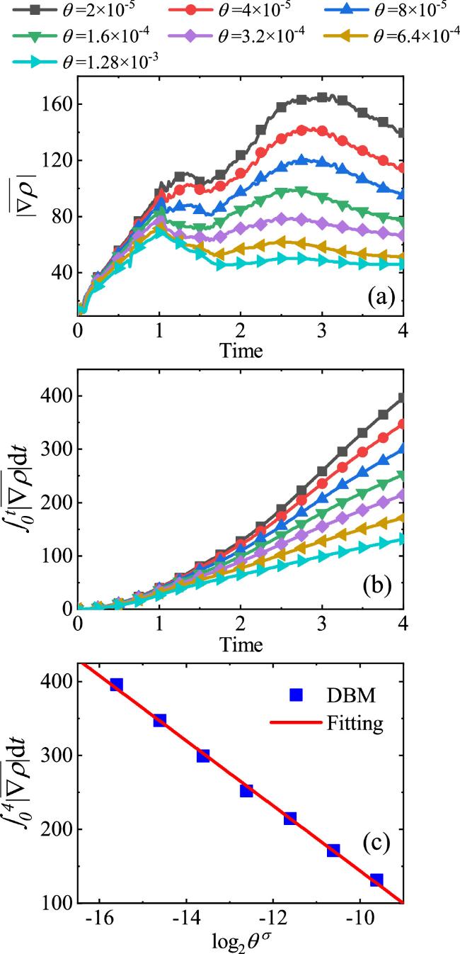 Figure 4. (a) Evolution of the average density gradient under different relaxation parameters, (b) growth of the time integral of the average density gradient and (c) the time integral of the average density gradient at t = 4.00 versus the value of ${\mathrm{log}}_{2}{\theta }^{\sigma }$.