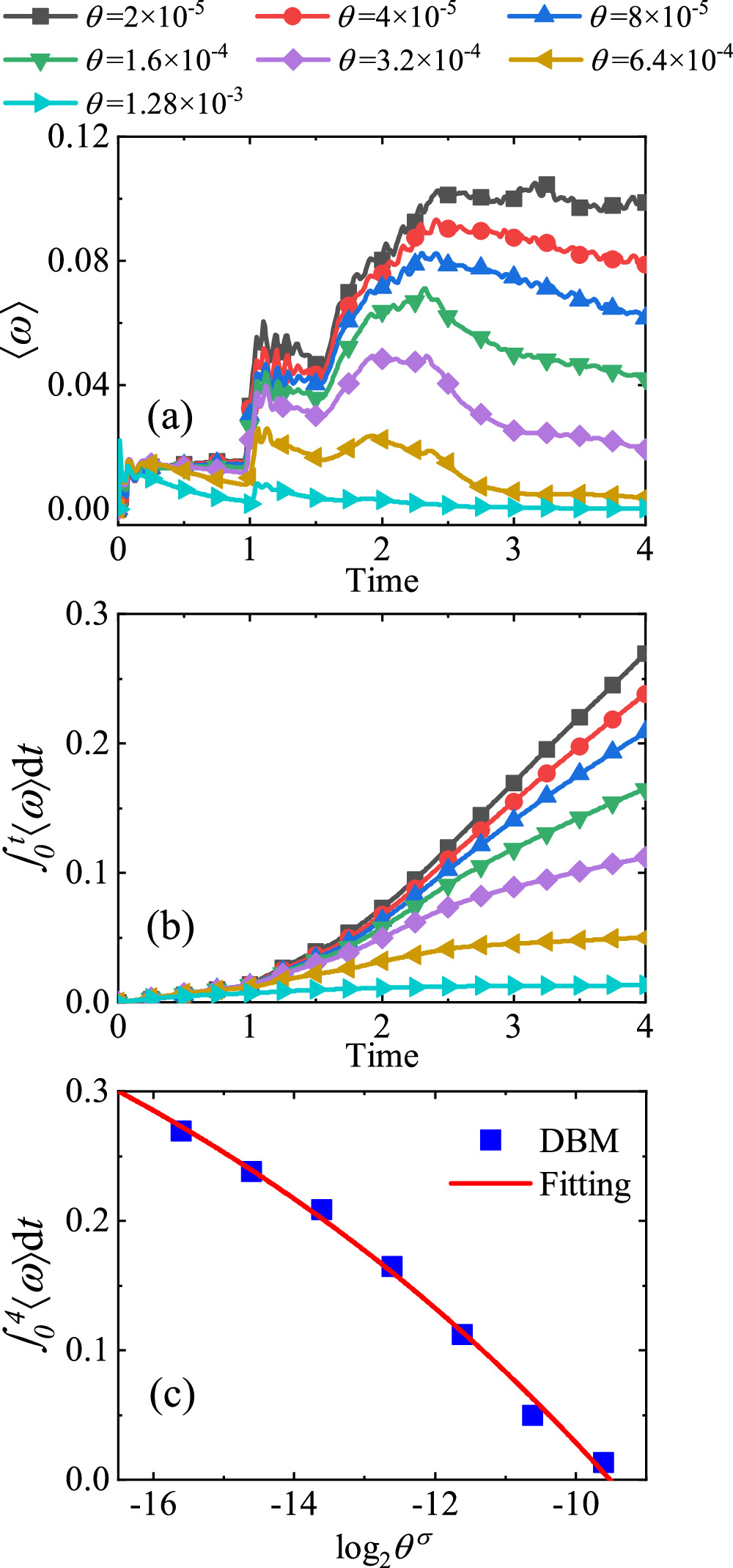 Figure 5. (a) Evolution of the global vorticity under different relaxation parameters, (b) growth of the time integral of the global vorticity and (c) the time integral of the global vorticity at t = 4.00 versus the value of ${\mathrm{log}}_{2}{\theta }^{\sigma }$.