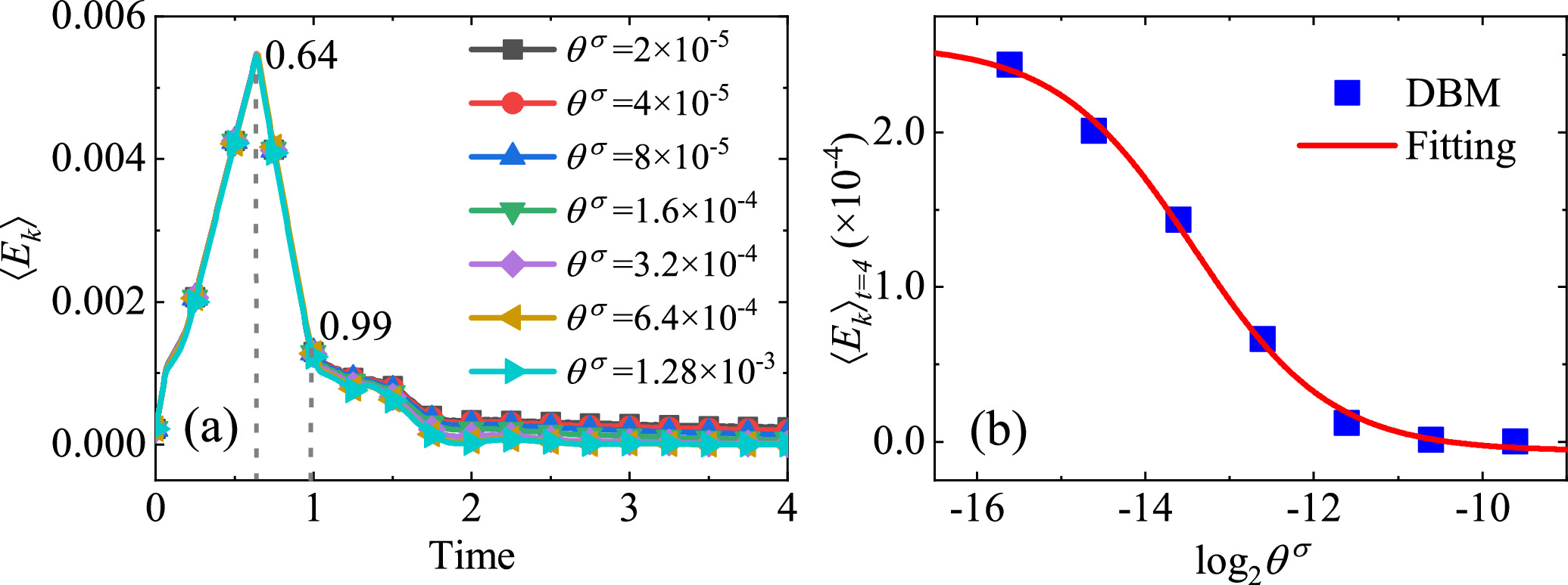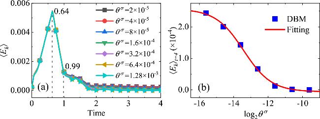 Figure 6. (a) Evolution of the total kinetic energy under different relaxation parameters and (b) the relationship between ${\mathrm{log}}_{2}{\theta }^{\sigma }$ and 〈Ek〉 at t = 4.00.