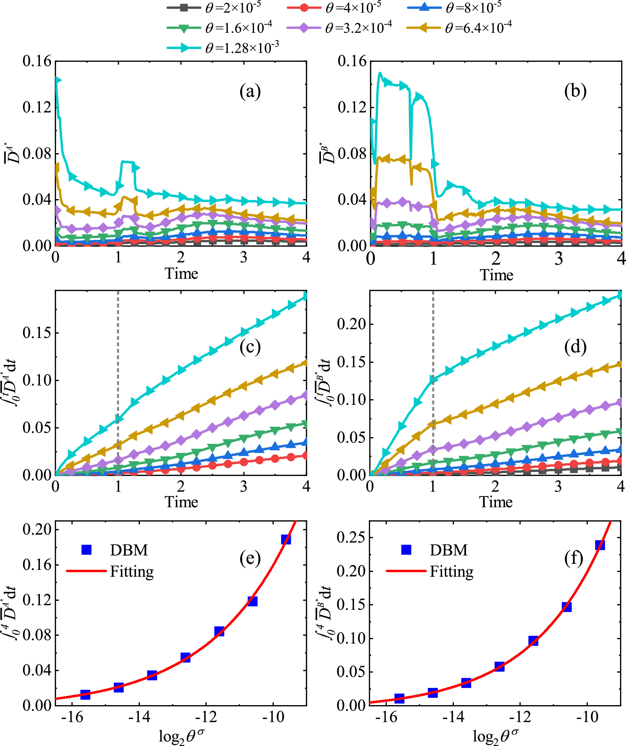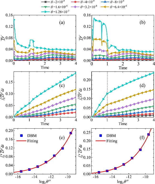 Figure 9. Global average TNE intensity for components A (a) and B (b) at different relaxation parameters; time integral growth of the global average TNE intensity for components A (c) and B (d); and time integral of the global average TNE intensity at t = 4.00 for components A (e) and B (f) as a function of ${\mathrm{log}}_{2}{\theta }^{\sigma }$.