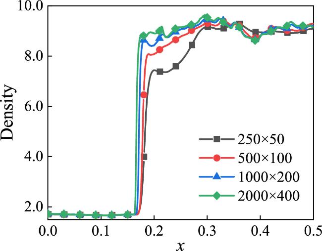 To ensure the accurate simulation of the RM instability, a grid independence test is conducted. Four different grid resolutions are examined with Nx × Ny = 250 × 50, 500 × 100, 1000 × 200 and 2000 × 400, where the corresponding space steps are Δx = Δy = 2.0 × 10−3, 1.0 × 10−3, 5.0 × 10−4 and 2.5 × 10−4, respectively. Figure 10 presents the density distribution along the centerline Ly/2 at t = 2.0 under the condition θA = θB = 2.0 × 10−5. It is found that the simulation results progressively converge as the grid resolution increases. The simulated results of 1000 × 200 and 2000 × 400 are close to each other. Therefore, a grid resolution of 2000 × 400 with a space step of Δx = Δy = 2.5 × 10−4 is adopted in this study as a reliable computational setup.