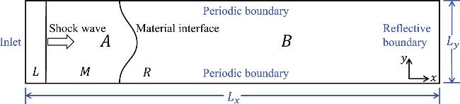 where the subscripts L, M and R represent three regions in the flow field: the left region (0 ≤ x < 0.025), the middle region (0.025 ≤ x < 0.125), the right region (0.125 ≤ x < 0.5), respectively. Regions L and M are filled with component A, where the particle mass is mA = 1. In contrast, region R contains component B, with nB = 1 and mB = 5.5. Between regions L and M is a shock front traveling rightwards with a Mach number Ma = 1.2. The physical quantities across the shock wave satisfy the Rankine–Hugoniot relations. Meanwhile, between regions M and R is a material interface separating components A and B. A sinusoidal perturbation is imposed on the material interface, described by $x=0.125+0.01\cos (2\pi y/{L}_{y})$.