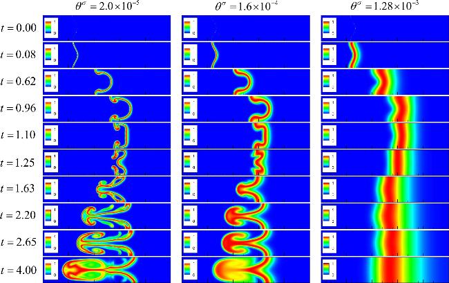 To intuitively assess the mixing state of the fluids, figure 7 shows the mixing degree contours in the RM process. From left to right, the three columns are for θσ = 2.0 × 10−5, 1.6 × 10−4 and 1.28 × 10−3, respectively. Let us focus on the first column as an example. Initially, there is no mass diffusion on either side of the material interface, and the fluid is in a non-mixed state. After the incident shock wave impacts the material interface, the perturbed interface grows, thereby enlarging the region where intense mixing occurs. However, the overall degree of mixing remains low at this stage. After the reshock wave passes through the material interface again, the mixed layer region expands significantly. The density and velocity gradients trigger the KH instability near the interface. This instability manifests as complex vortex structures that further amplify the fluid instability. At the same time, the heavy fluid gradually intrudes into the light fluid, and the width of the mixed layer increases rapidly due to the development of RM instability, which is manifested as a significant expansion of the mixed regions.