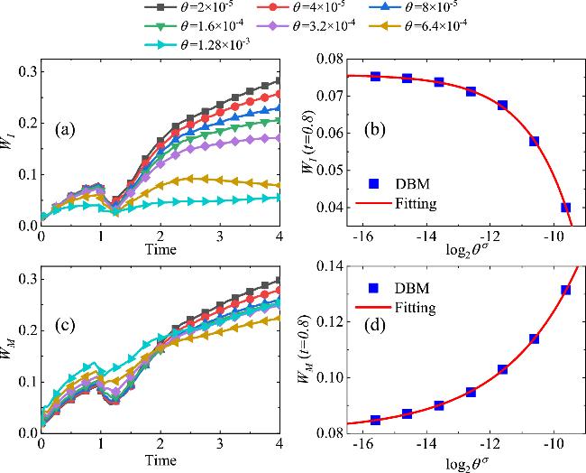 Figure 8. Evolution of the interface width (a) and mixed layer width (c) under different relaxation parameters, the relationship between ${\mathrm{log}}_{2}{\theta }^{\sigma }$ and the interface width (b) and mixed layer width (d) at t = 0.8.