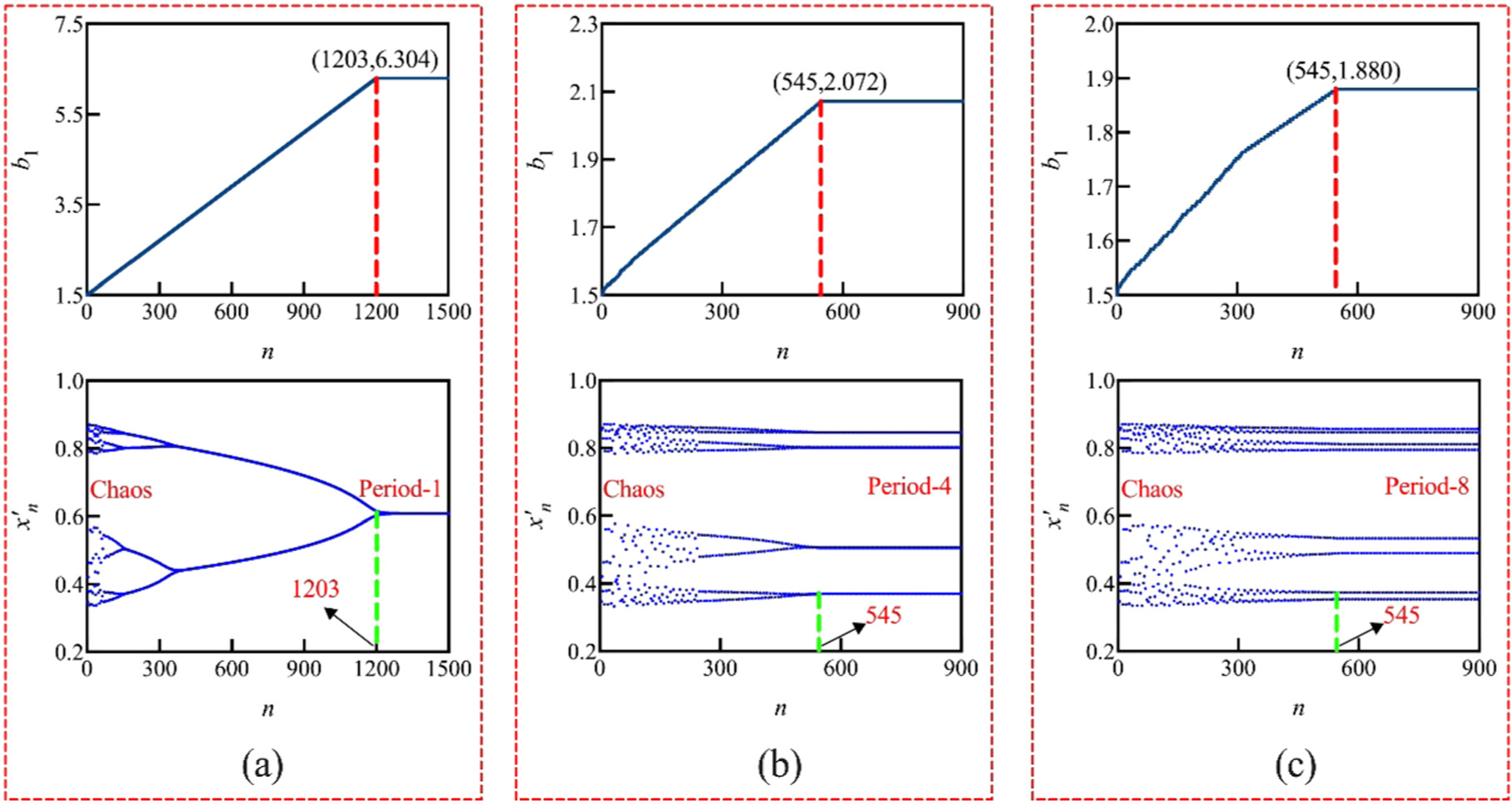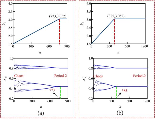 The results in figure 9 illustrate that the chaotic map neuron can be controlled to period-2 patterns by the adaptive growth method in equation (18), and parameter b1 is also to reach a stable value. The gain is increased, and the parameter reaches a stable value in fewer iterations. Furthermore, the gain κ0 = 0.004, the case of the different threshold ϵ is figure 10.