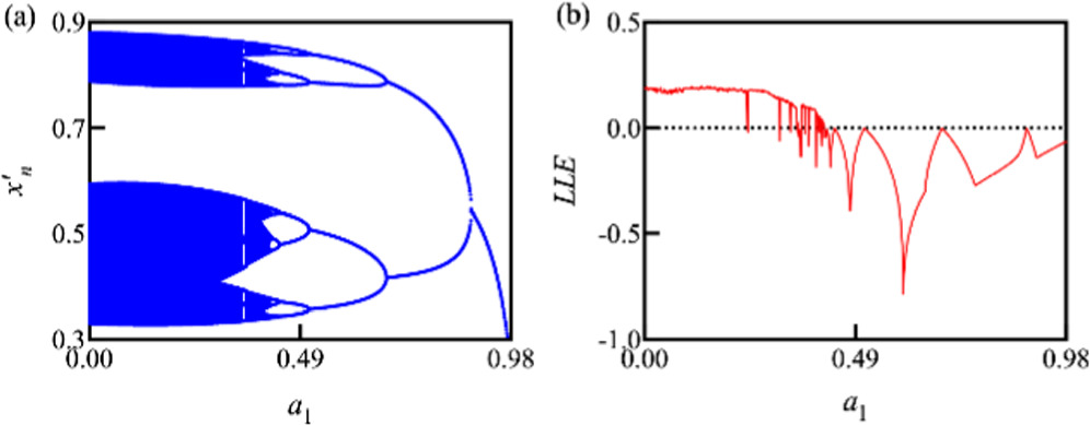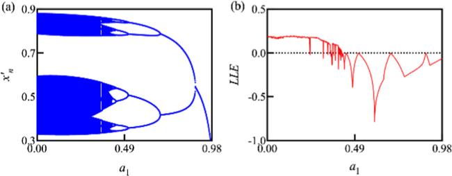 The dynamic of the map neuron in equation (14) is estimated by using the numerical simulation with the iterative method on the MATLAB. At first, parameters of the map neuron with a hybrid ion channel are set at r1 = 3.8, c1 = 0.1, d1 = 0.1, e1 = 3.6316, g1 = 0.1, α1 = 0.1, β1 = 0.2, λ1 = 0.1, and its initial value is (0.01, 0.1, 0.1, 0.1). For parameter b1 = 1.5, a1 is changed from 0 to 0.98, the largest Lyapunov exponent (LLE) and bifurcation diagram can be obtained, and the results are shown in figure 2.