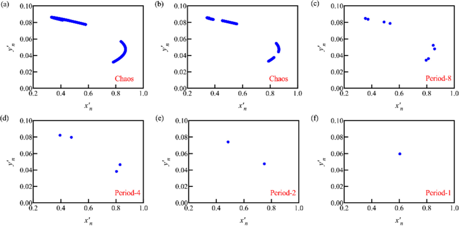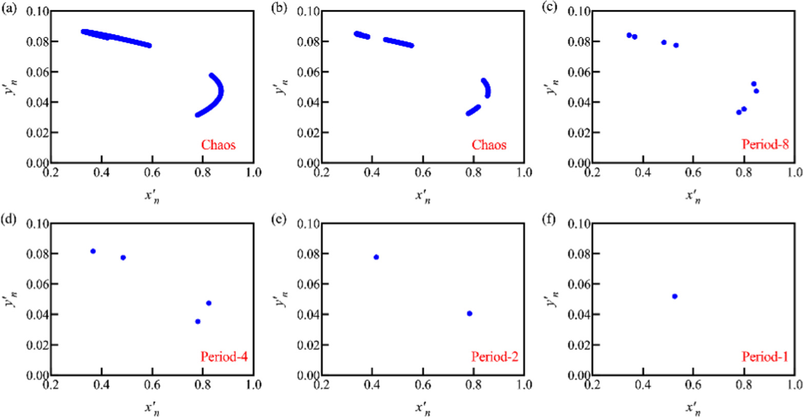 The dynamic in figure 2 shows that the map neuron with a hybrid ion channel evolves from a chaotic state to a periodic state by period-doubling bifurcation in the process of parameter enlargement. Furthermore, the phase portraits with different states are shown in figure 3.