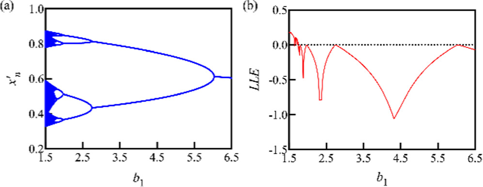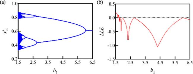 Figure 5. Bifurcation diagram and LLE with different parameter b1. For (a) bifurcation diagram for parameter b1; (b) LLE for parameter b1.