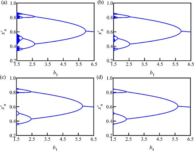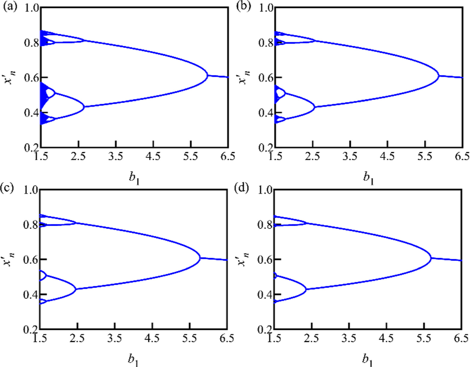 Figure 8. Bifurcation diagram of the map neuron in equation (17) by changing parameter b1 under different φext. For (a) φext = 0.1; (b) φext = 0.2; (c) φext = 0.3; (d) φext = 0.4.