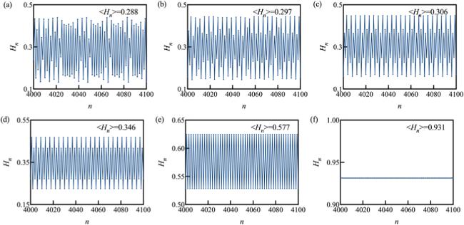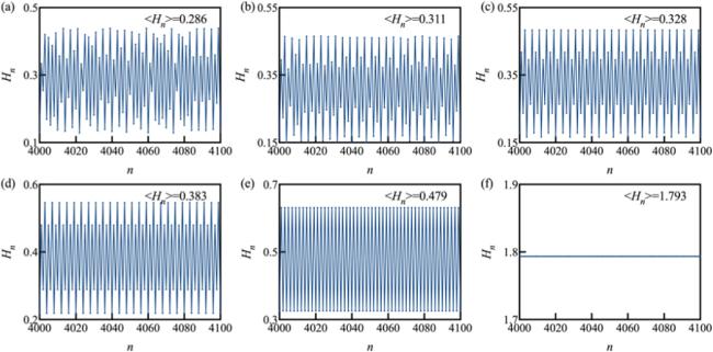 Figure 4. Evolution of Hn for different parameter a1. For (a) a1 = 0.2; (b) a1 = 0.392; (c) a1 = 0.47; (d) a1 = 0.6; (e) a1 = 0.7; (f) a1 = 0.9. <Hn> is a mean value of energy within 100 iterations.