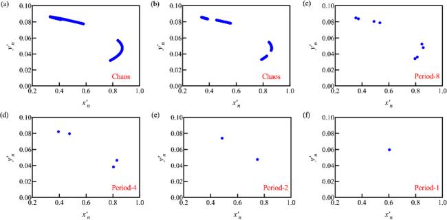 Figure 3. Attractor phase of the map neuron with different parameter a1. For (a) a1 = 0.2; (b) a1 = 0.392; (c) a1 = 0.47; (d) a1 = 0.6; (e) a1 = 0.7; (f) a1 = 0.9.