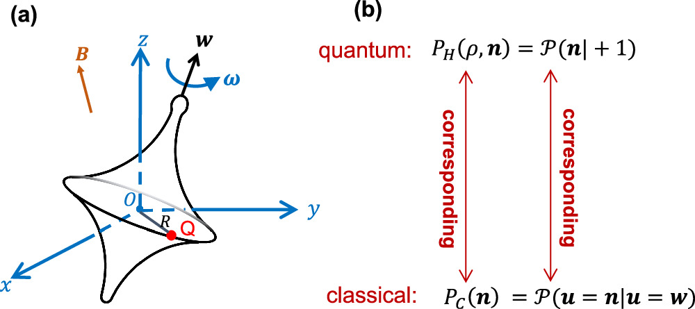 Figure 3. (a) A charged spinning top precessing in a homogeneous magnetic field, which is a classical analogy of a spin-1/2 particle. Here, O is the center-of-mass of the top, and w is the unit vector along the symmetry axis. Other details are introduced in sections |