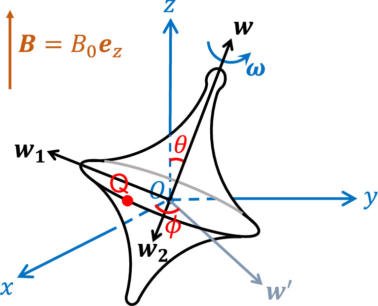 Figure 4. A charged spinning top precessing in a homogeneous magnetic field B=B0ez. Here, O is the CoM of the top, O-xyz is the CoM frame, w is the unit vector along the symmetry axis of the top. The unit vectors w1 and w2 are mutually perpendicular unit vectors, both of which are also perpendicular to w. Other details are introduced in Appendix |