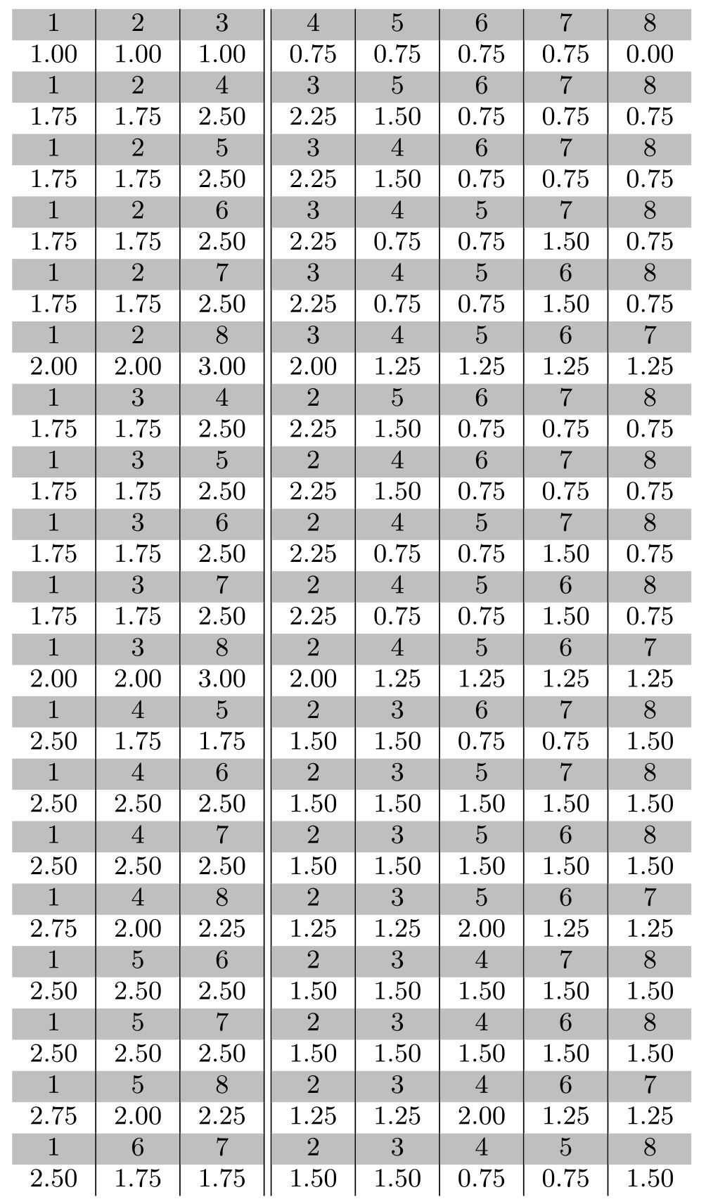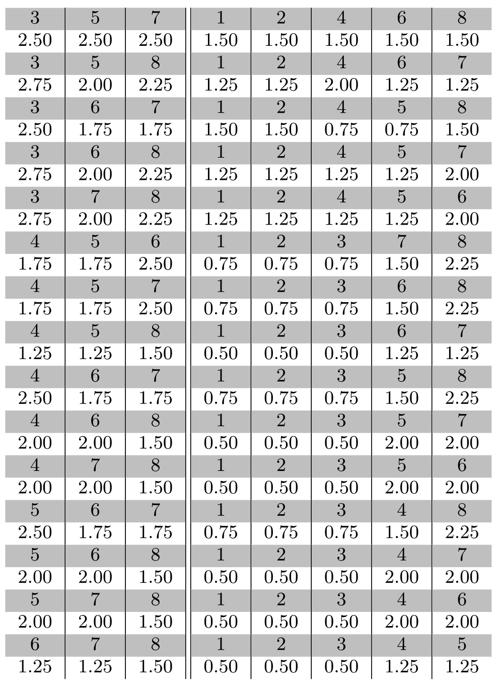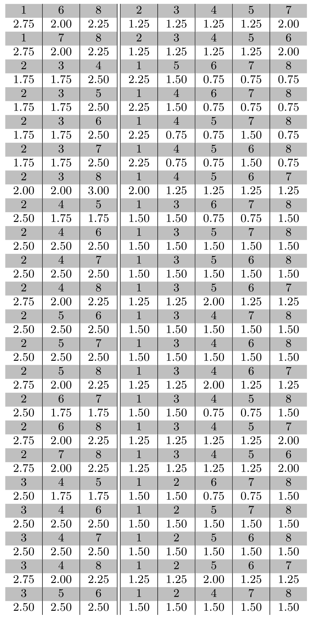 As can be seen, the off-diagonal combinations do not all vanish simultaneously, meaning that the Lie algebra has no ideals of either dimension 3 nor 5 (we of course know that the ${\mathfrak{su}}(3)$ Lie algebra has no ideal of any dimension, but it is reassuring to see this appear in the tabulated data). One might entertain the hope that a clever way of splitting the structure constants could bring about a breaking of the global symmetry even for a simple Lie algebra, perhaps of large dimension, but we have not found an example yet, nor do we know at this point of a theorem (such as the no-go theorem of Vafa and Witten in the fermion sector) that forbids it.