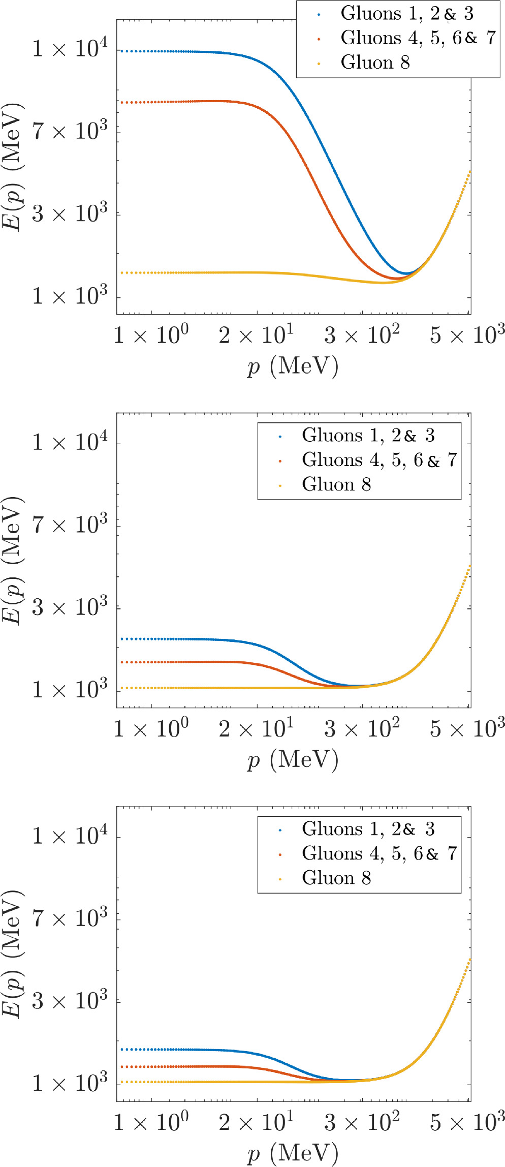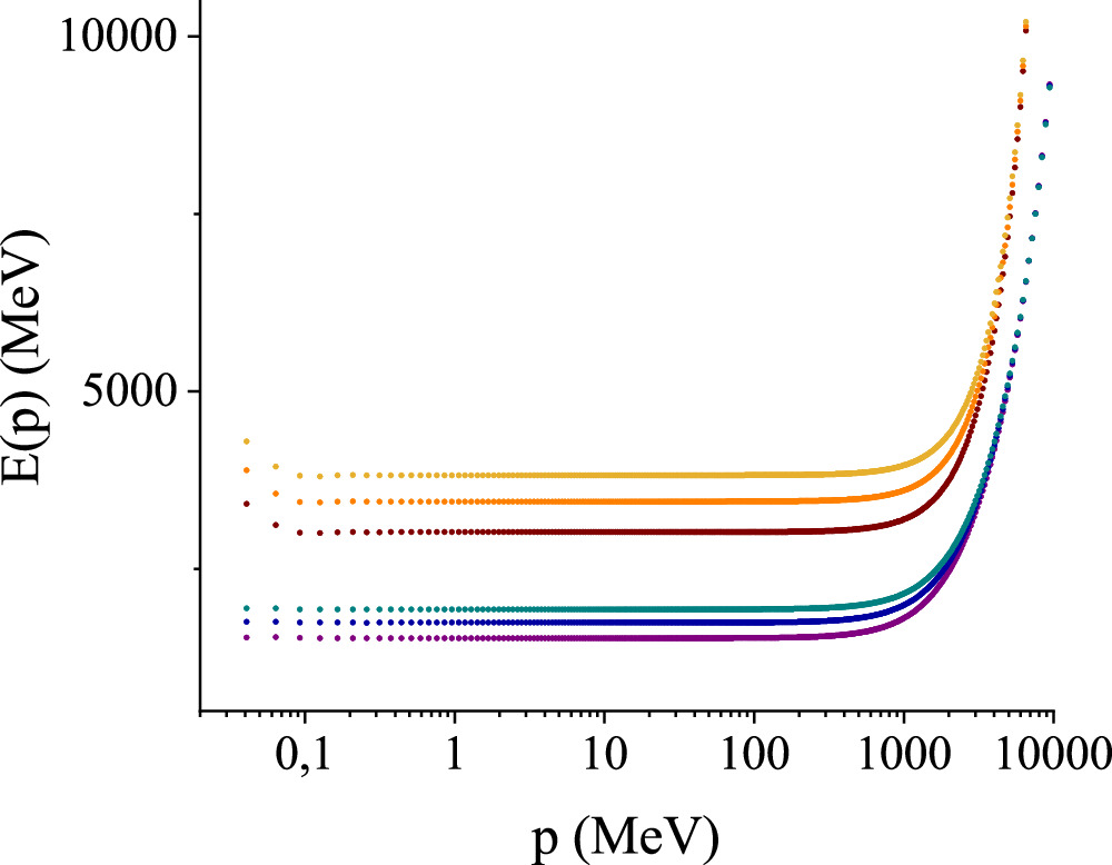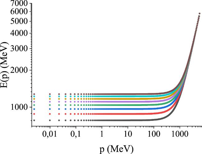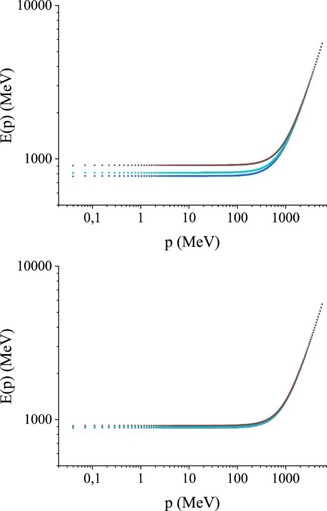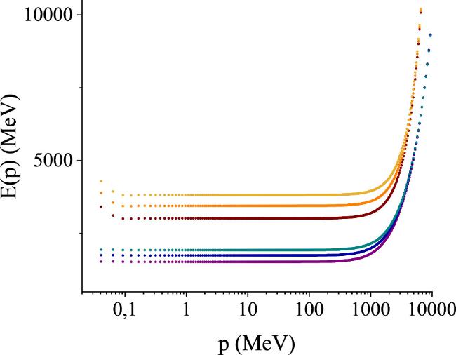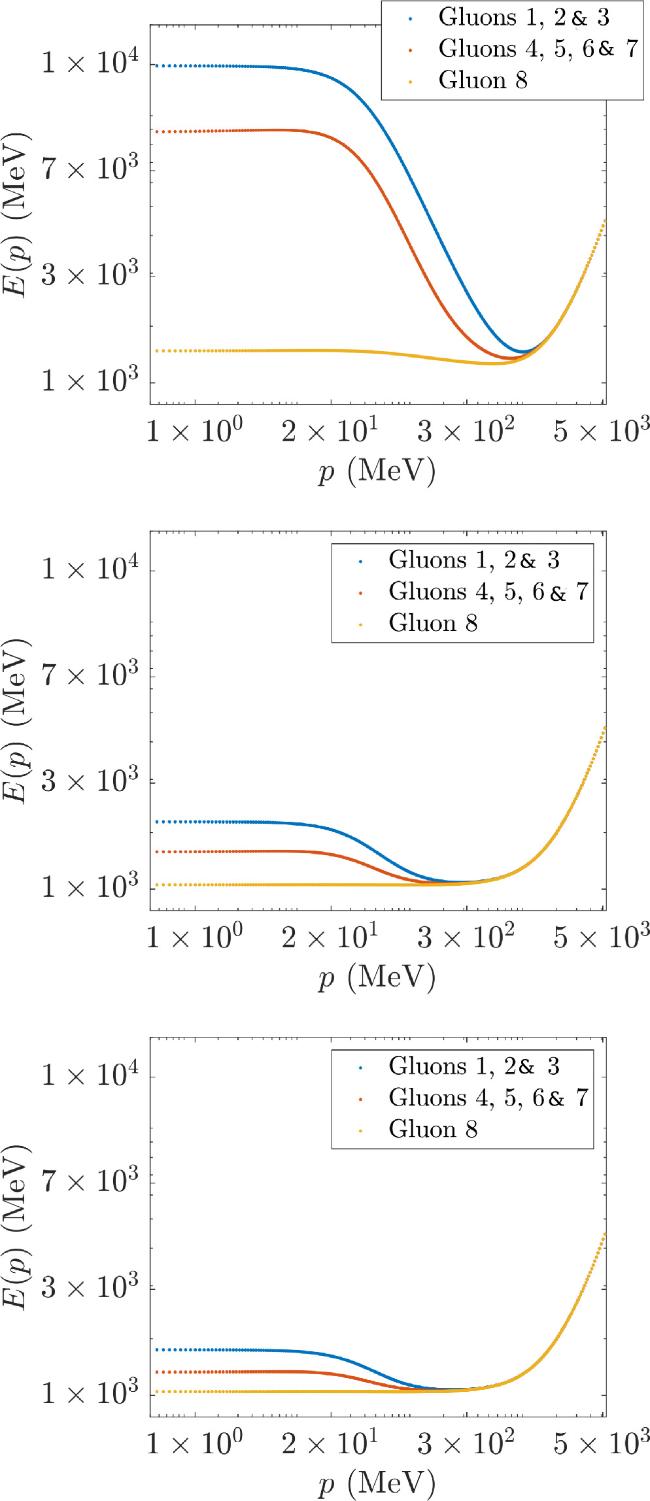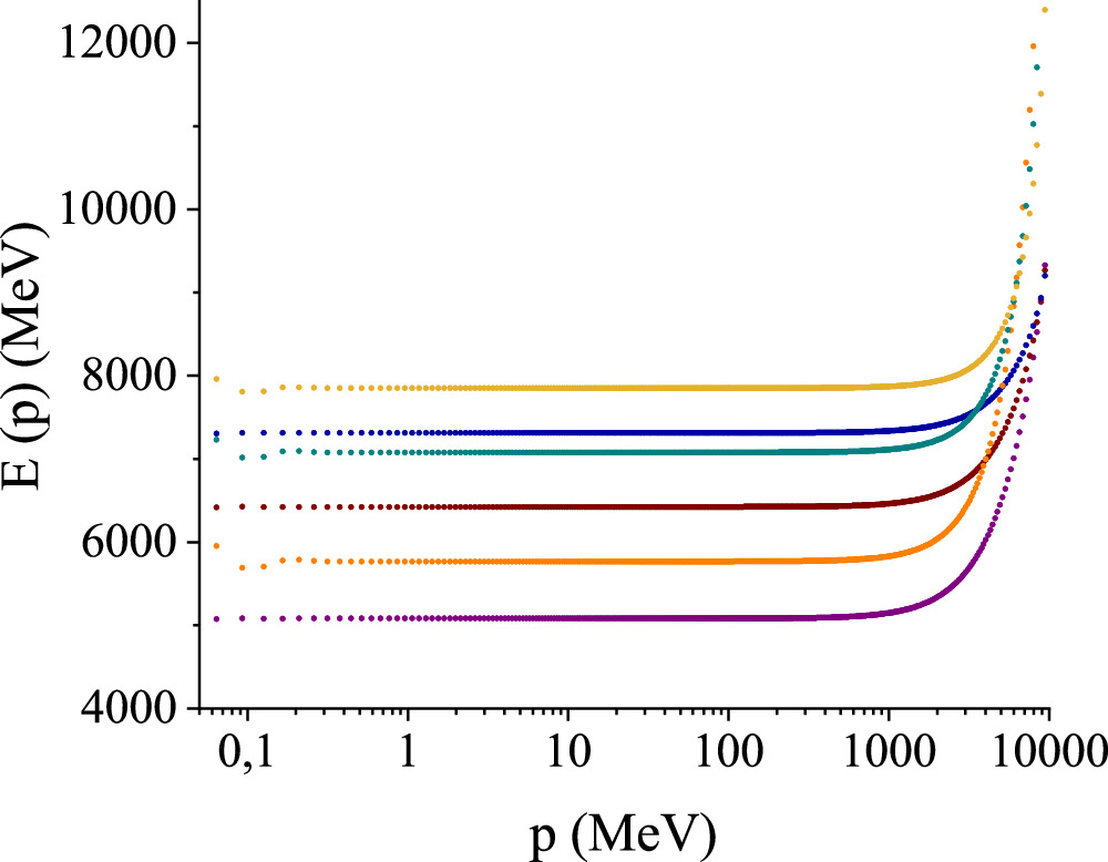 Figure 3. Dispersion relations E(p) solving the gauge-boson gap equation (17) renormalized by means of a MOM subtraction with scale μ=9 GeV for SU(3), SU(4) and SU(5), all with the same strong coupling constant αs=1 in equation (21). The cutoffs here are small, at k1=10 GeV (lower bunch) and k2=20 GeV (upper bunch): the sensitivity thereto then quickly diminishes as k is removed beyond 20 GeV towards infinity.