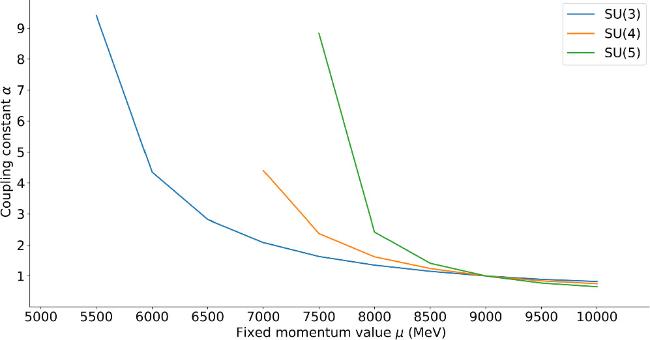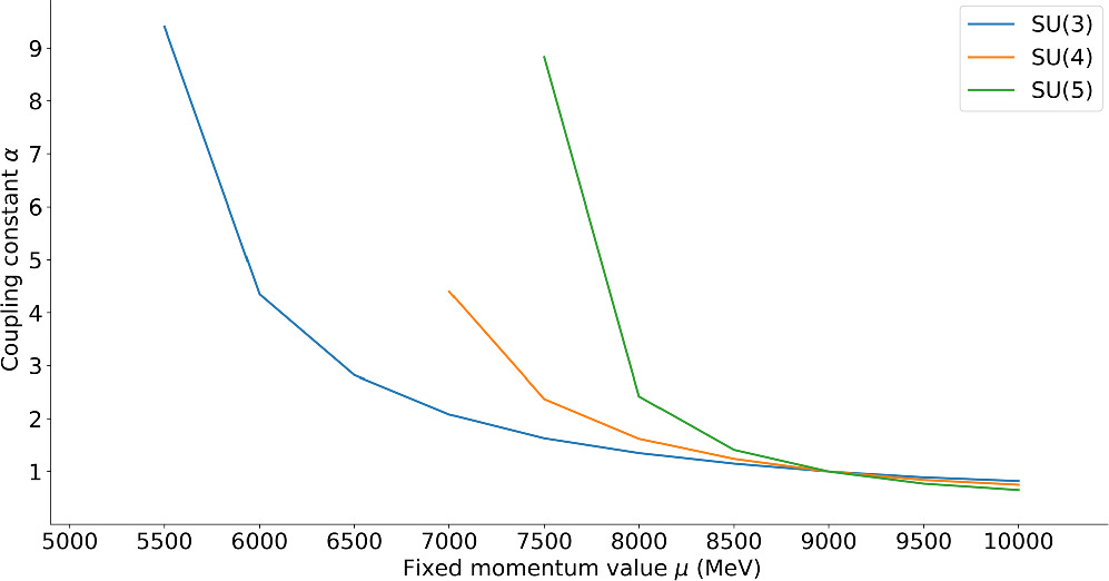 The mass gap E(p=0, μ)=M(μ) is set by the MOM renormalization condition E(p=μ)=Mreference which directly controls the generated mass; this is typical of dimensional analysis in field theory. If the scale μ is lowered (increased) and one wishes for the same observable gap E(p=0), the coupling constant has to be accordingly increased (decreased) as shown, for three small SU(N) groups, in figure 4.