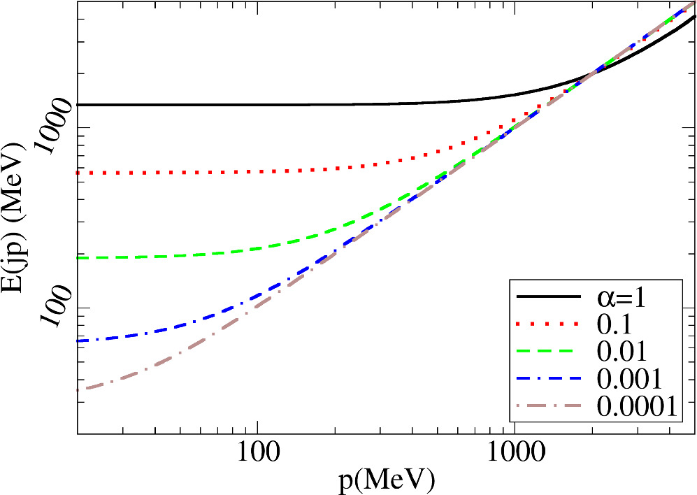 Figure 5 shows the sensitivity of the dispersion relation to diminishing the coupling constant. The mass gap does not disappear at a critical point in this setup, but disappears with the coupling, remaining proportional to the renormalization scale (known truncations of Dyson-Schwinger equations in the fermion sector [37] do show a critical point for the fermion-mass dynamical chiral-symmetry breaking, but this is not the case in the gauge-boson sector). This does not entail that a photon mass is necessarily generated, as equation (22) is specific for non-Abelian gauge theories and its kernel vanishes for electrodynamics as it stems from boson-boson interactions which are not fermion mediated. A U(1) theory, with fabcfabc=0, automatically yields a trivial dispersion relation E(k)=k and no photon mass.