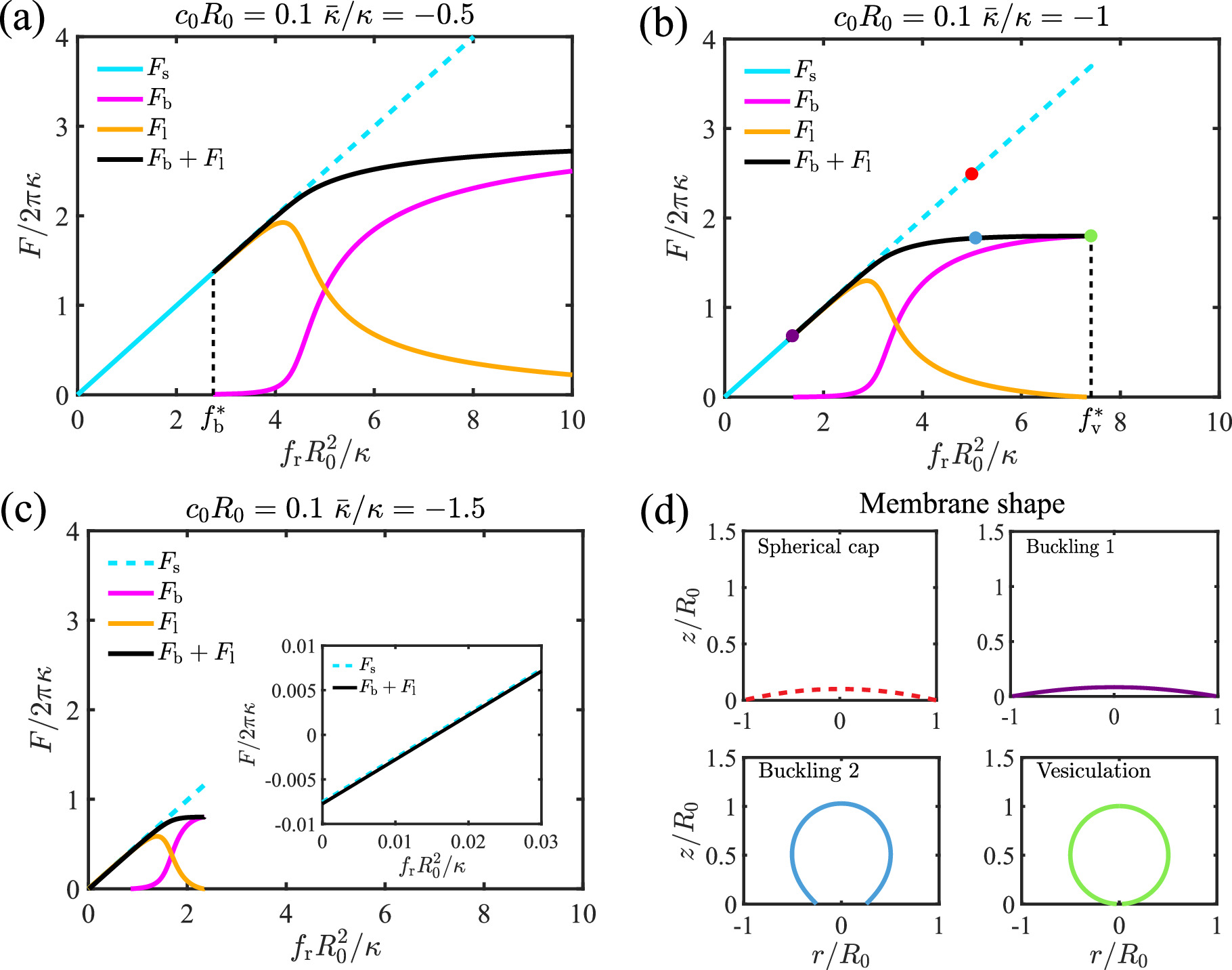Figure 2. Effect of the stress ${f}_{\,\rm{r}\,}{R}_{0}^{2}/\kappa $ on the free energy F/2πκ of the membrane with a scaled spontaneous curvature c0R0=0.1 based on different Gaussian curvatures (a) $\bar{\kappa }/\kappa =-0.5$, (b) $\bar{\kappa }/\kappa =-1$, and (c) $\bar{\kappa }/\kappa =-1.5$. (d) demonstrates the membrane shapes corresponding to the colored dots in (b).