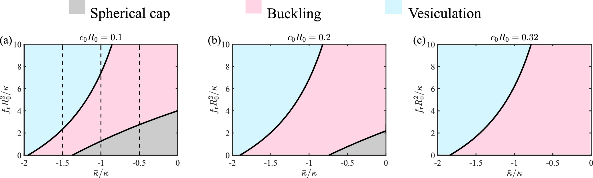 Figure 3. Phase diagram of the membrane shape as a function of the Gaussian curvature modulus $\bar{\kappa }/\kappa $ and the compressive stress ${f}_{\,\rm{r}\,}{R}_{0}^{2}/\kappa $ under different spontaneous curvatures (a) c0R0=0.1, (b) c0R0=0.2 and (c) c0R0=0.32. The dashed lines in (a) represent the cases of figure 2(a), (b) and (c), respectively.