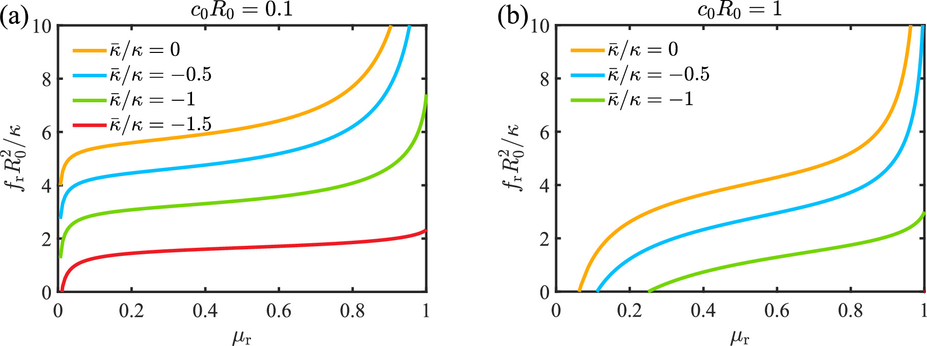 In this section, we propose a method to determine the Gaussian curvature modulus $\bar{\kappa }$ and the spontaneous curvature c0 simultaneously via a buckling protocol. We assume that the stress-strain relationship of a buckled membrane can be obtained either via molecular dynamics simulation or experiments. In figure 6, we show the stresses at two different strains fr(μr=0.3) and fr(μr=0.6) as a function of the scaled spontaneous curvature c0R0 and the Gaussian curvature modulus $\bar{\kappa }/\kappa $. It is found that the contours of the stress are approximately linear with different slopes for μr=0.3 and μr=0.6. They can be approximately featured by