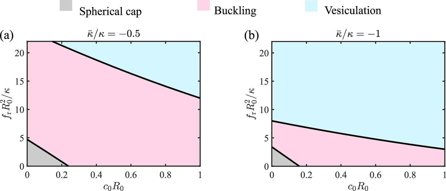 Figure 5. Phase diagram of the membrane constructed by the scaled spontaneous curvature c0R0 and stress ${f}_{\,\rm{r}\,}{R}_{0}^{2}/\kappa $ under different Gaussian curvature moduli (a) $\bar{\kappa }/\kappa =-0.5$ and (b) $\bar{\kappa }/\kappa =-1$.