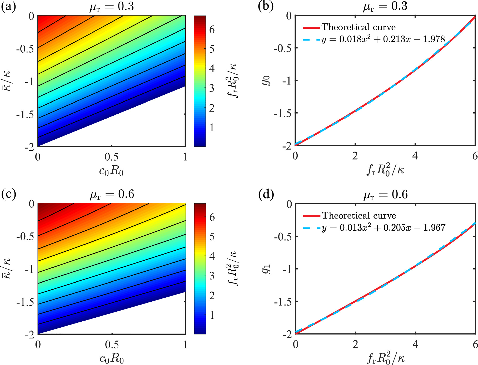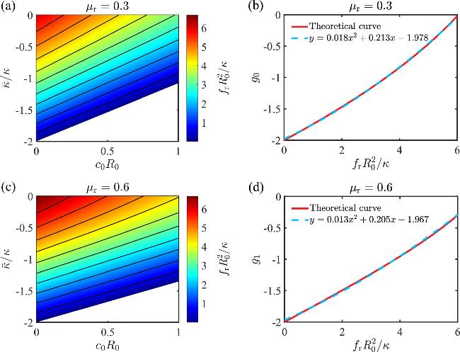 Figure 6. Measuring the spontaneous curvature c0R0 and the Gaussian curvature modulus $\bar{\kappa }/\kappa $ of a membrane using the stress-strain relationship in a buckling process. (a, b) The buckling stress ${f}_{\,\rm{r}\,}{R}_{0}^{2}/\kappa $ at a buckling strain μr=0.3 as a function of c0R0 and $\bar{\kappa }/\kappa $ in (a). The contour lines approximately have the same slope and can be fitted with a linear function $\bar{\kappa }/\kappa =1.12{c}_{0}{R}_{0}+{g}_{0}({f}_{\,\rm{r}\,0}{R}_{0}^{2}/\kappa )$, where the intercepts g0(x) can be approximately featured by a quadratic function shown in (b). (c, d) The same as in (a, b) except that the strain μr=0.6. The contour lines can be characterized by a linear function $\bar{\kappa }/\kappa =0.80{c}_{0}{R}_{0}+{g}_{1}({f}_{\,\rm{r}\,1}{R}_{0}^{2}/\kappa )$, where the intercepts g1(x) can be fitted by a quadratic function shown in (d). The empty areas in (a) and (c) indicate regions where a negative stress is required to maintain a buckled shape at strains μr=0.3 and μr=0.6. In these regions, spontaneous buckling would occur, preventing a well-defined transition from a spherical cap to a buckled shape. Since our focus is on using buckling as a protocol to measure $\bar{\kappa }/\kappa $ and c0R0, these cases are beyond the scope of our study.