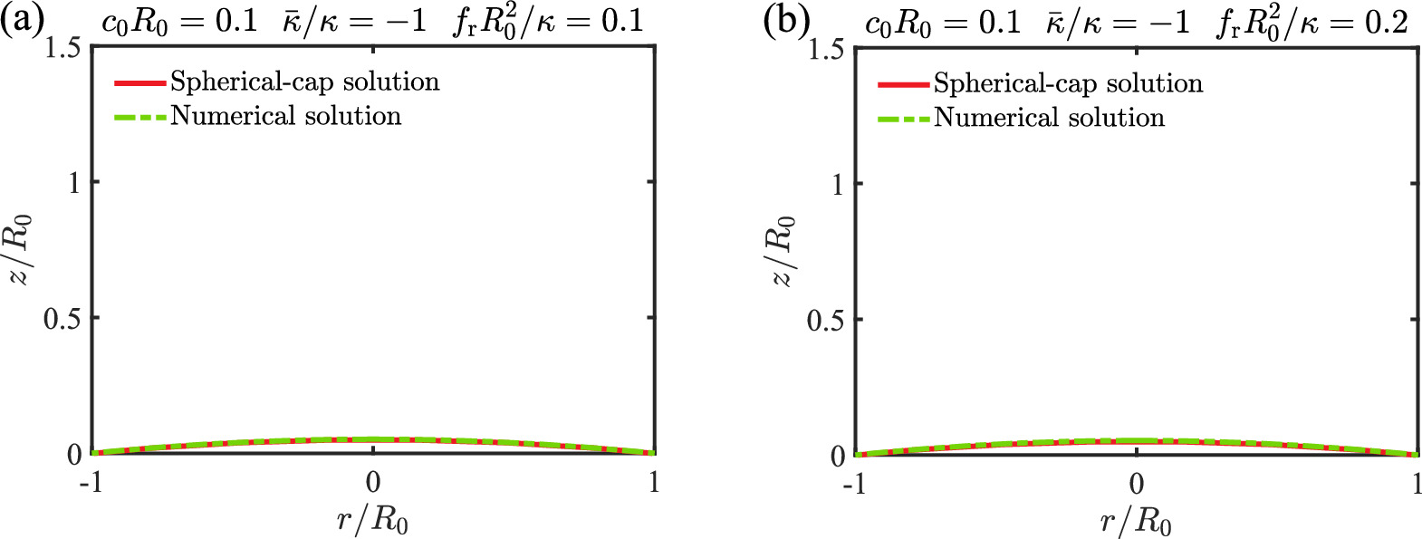 Figure 7. Comparison between the spherical cap solution and the exact numerical solution for boundary stresses below the critical buckling stress (${f}_{\rm{r}\,}\lt {f}_{\,\rm{b}}^{* }$). (a) and (b) show results for different values of fr.