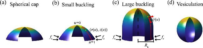 to fix the base radius. We always begin with a nearly flat membrane, defined by r(u)=ε+Rbu and z(u)=z0(1-u2), where ε=0.0001 is chosen so as to prevent singularities at the membrane tip, and z0=0.01 slightly elevates the membrane. Then we iteratively solve the problem by reducing the base radius Rb with a small increment ΔRb until Rb is almost zero. The solution for Rb+ΔRb is used for the guessed solution for Rb. In this way, we obtain the stress fr for different strain ${\mu }_{\rm{r}\,}=1-{R}_{\,\rm{b}}^{2}/{R}_{0}^{2}$, i.e., the stress-strain relationship.