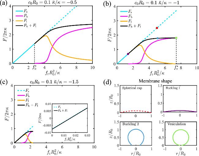 In this section, we study the effects of Gaussian curvature modulus on the buckling of a circular membrane in response to a compressive stress fr. The spontaneous curvature of the membrane is fixed at c0R0=0.1. In addition to the spherical cap solution (figure 2, cyan line), a new branch of solutions, which represent a buckled membrane shape, emerges when the stress fr is beyond a critical value ${f}_{\,\rm{b}\,}^{* }$ (black curve in figure 2). The total free energy of the buckled membrane shape F=Fb+Fl is lower than that of the spherical cap Fs, indicating the occurrence of a buckling transition. Upon further increase of the stress fr to ${f}_{\,\rm{v}\,}^{* }$, the degree of membrane buckling is enhanced until the base radius is narrowed down to almost zero (figure 2(d)), which is termed vesiculation for the rest of the paper. Here it should be emphasized that the buckled membrane shapes deviate from a spherical cap, except at the vesiculation point (see figure 8 and appendix F). Therefore, our method is different from the vesicle closure simulation [48,49], in which the membrane is assumed to be a spherical cap and closure is driven by a constant edge tension that favors a closed vesicle. When comparing the free energy curves for different Gaussian curvature moduli $\bar{\kappa }$, we find that both the critical stress of membrane buckling ${f}_{\,\rm{b}\,}^{* }$ and the stress of vesiculation ${f}_{\,\rm{v}\,}^{* }$ are reduced for more negative $\bar{\kappa }$ (compare figures 2(a), (b), and (c)). In particular, when $\bar{\kappa }/\kappa =-1.5$, the buckled shape solutions appear even in the absence of compressive stresses and has a lower free energy than the spherical cap solution, indicating a spontaneous buckling of the membrane (figure 2(c)).
