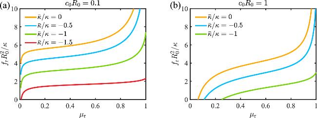 The effect of the Gaussian curvature modulus on the buckling behavior of membrane can be further reflected on the stress-strain relationship shown in figure 4. We quantify the buckling degree of the membrane by introducing the strain μr=(A0-Ab)/A0, where ${A}_{\rm{b}\,}=\pi {R}_{\,\rm{b}}^{2}$ represents the base area of the buckled membrane. The stress fr(μr=0) defines the critical buckling stress ${f}_{\,\rm{b}\,}^{* }$ and the stress fr(μr=1) defines the critical vesiculation stress ${f}_{\,\rm{v}\,}^{* }$. At the beginning of the buckling when μr is small, the stress fr increases rapidly with μr. At intermediate μr, the stress fr mildly with μr. At the end of the buckling when μr is close to 1, the stress fr rises rapidly again with μr. The vesiculation stress ${f}_{\,\rm{v}\,}^{* }$ can be significantly reduced with more negative $\bar{\kappa }$.
