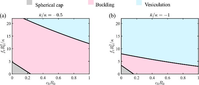 To systematically investigate how the Gaussian curvature moduli $\bar{\kappa }$ influence the buckling behavior of a circular membrane, we show the phase diagram of the membrane shape as a function of $\bar{\kappa }$ and the stress fr in figure 3 for different spontaneous curvature c0. When c0R0=0.1 or 0.2, the phase diagram is divided into three parts, separated by the curve of critical buckling stress ${f}_{\,\rm{b}\,}^{* }$ (figures 3(a) and (b), the boundary between the pink region and the grey region), and the curve of critical vesiculation stress ${f}_{\,\rm{v}\,}^{* }$ (figures 3(a) and (b), the boundary between the pink region and the blue region). The area of the grey region, which represents the spherical cap shape, is reduced with increasing spontaneous curvature c0, and vanishes when c0 is large (figure 3(c)). Overall, the results suggest that a negative Gaussian curvature modulus $\bar{\kappa }$ and a positive spontaneous curvature c0 tend to facilitate the buckling by reducing the critical buckling stress ${f}_{\,\rm{b}\,}^{* }$. However, the critical vesiculation stress ${f}_{\,\rm{v}\,}^{* }$ is not strongly influenced by the spontaneous curvature.