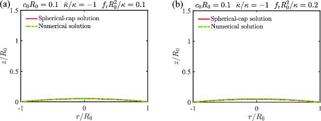 in equation (E5), then η(u)=0 is satisfied. In the absence of boundary stress (i.e., ${\bar{f}}_{\,\rm{r}\,}=0$), equation (E4) implies γ=0, meaning the spherical cap solutions always satisfy all the shape equations and boundary conditions. However, when a boundary stress is applied, the spherical cap solutions (E1)-(E6) satisfy all the shape equations and boundary conditions, except that $\gamma (u)={R}_{\,\rm{cap}\,}{\bar{f}}_{\,\rm{r}\,}\sin (u\theta )$ only approximately satisfies the boundary condition γ(u=1)=0 in equation (B5). This approximation holds for small ${\bar{f}}_{\,\rm{r}\,}$ and θ, which is generally valid when fr remains below the critical stress ${f}_{\,\rm{b}\,}^{* }$. To demonstrate that, we compare the spherical cap solution with the exact numerical solutions and find a good agreement between them in figure 7.