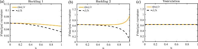 In figure 2(d), we show the buckled membrane shapes for c0R0=0.1 and $\bar{\kappa }/\kappa =-1$, and stress that the buckled shapes deviate from a spherical cap except the one at vesiculation point. To tell that, we show the two principal curvatures of the shapes in figure 8, where deviation between the two principal curvatures are observed for the first two buckled shapes. At the vesiculation point, the buckled shape becomes a sphere such that the two principal curvatures overlap and remain constant.