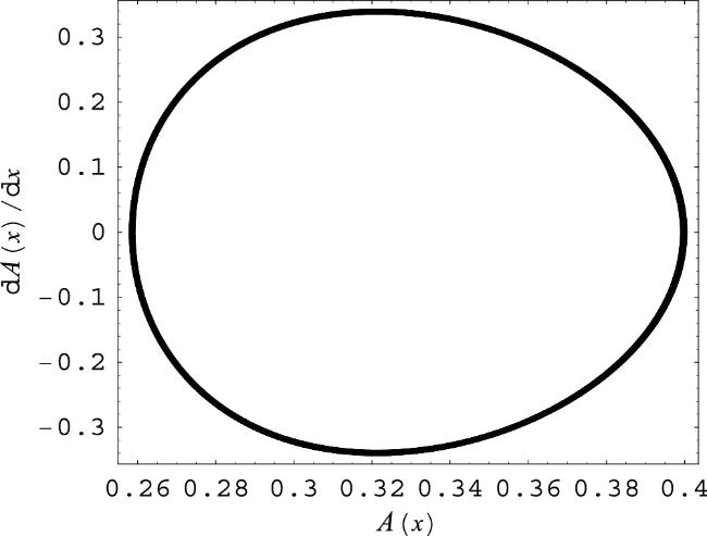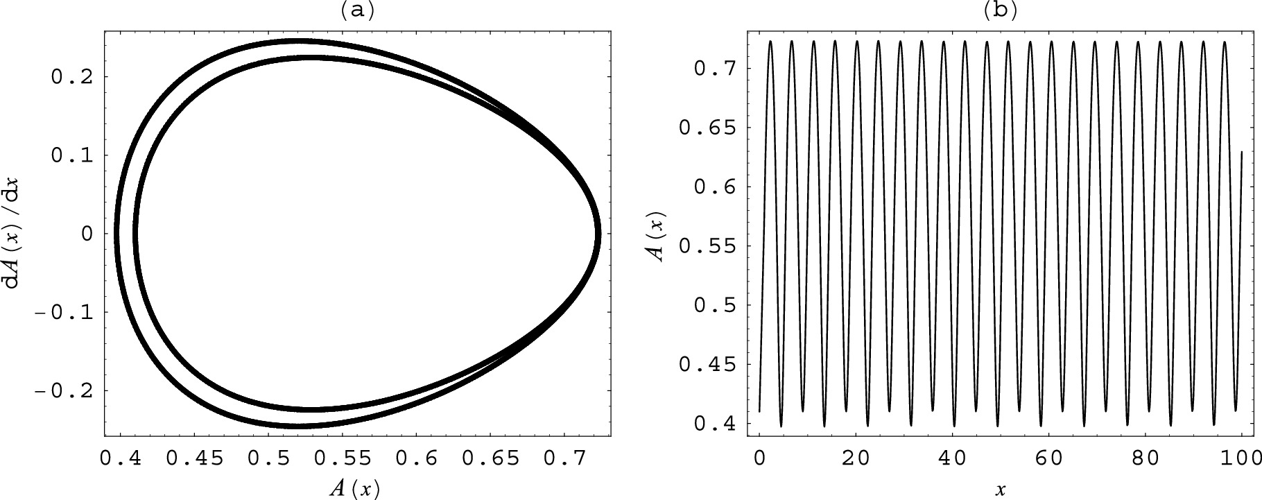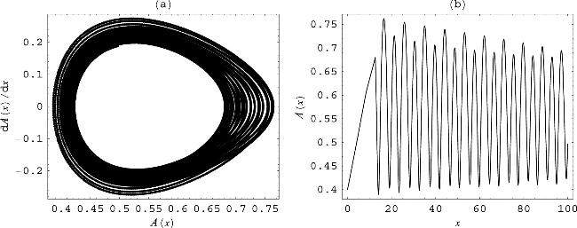 Figure 1. (a) is the phase portrait in the ($A,\dot{A}$) plane and (b) is the spatial evolution of A(x) for g0=0.68, g1=0.045, μ=0.6, j=0.5, k=0.35, A(0)=0.4 and $\dot{A}(0)=0$.
