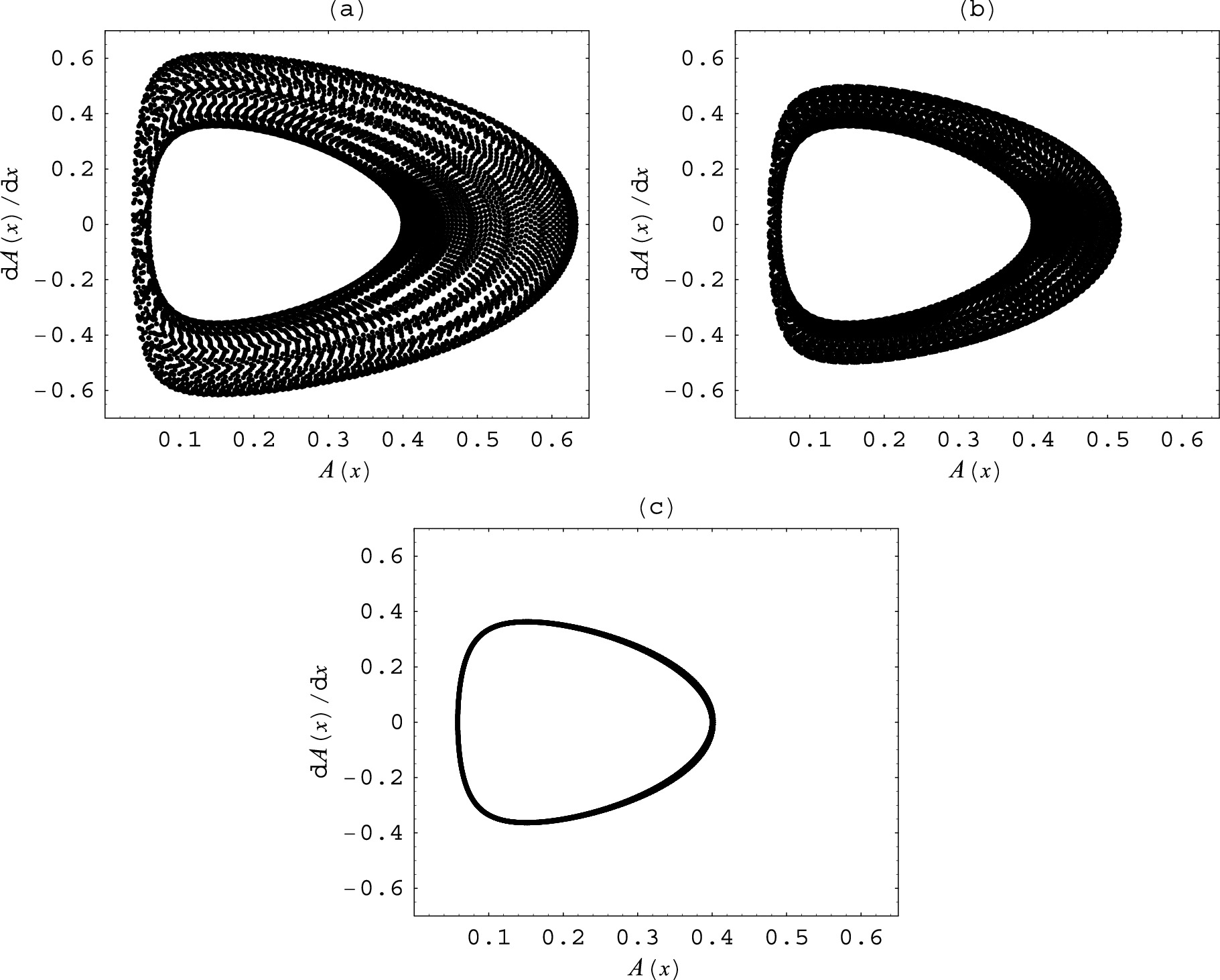 Figure 4. Phase portraits in the ($A,\dot{A}$) plane for g0=0.57, g1=0.56, μ=0.6152, j=0.05, A(0)=0.4 and $\dot{A}(0)=0$. (a) k=1.1, (b) k=1.14 and (c) k=5.