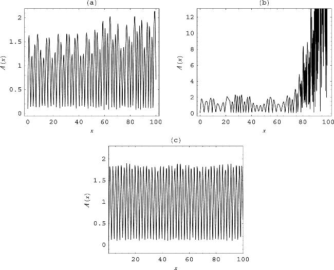 Figure 5. Spatial evolutions of A(x) for g0=-0.4, g1=-0.3995, j=0.5, A(0)=0.1 and $\dot{A}(0)=0$. (a) μ=0.47 and k=1, (b) μ=0.12 and k=1, (c) μ=0.12 and k=4 and the other parameters and initial conditions are the same as (a).