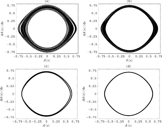 Figure 6. Phase portraits in the ($A,\dot{A}$) plane for g0=1.4, g1=0.12, μ=0.904, A(0)=0.62 and $\dot{A}(0)=0$. (a) k=1, (b) k=1.03, (c) k=1.2 and (d) k=4.