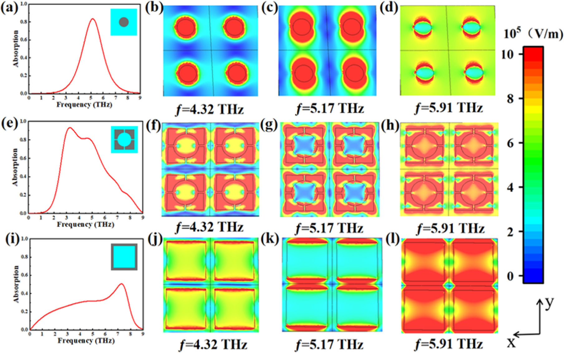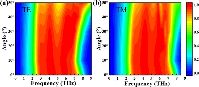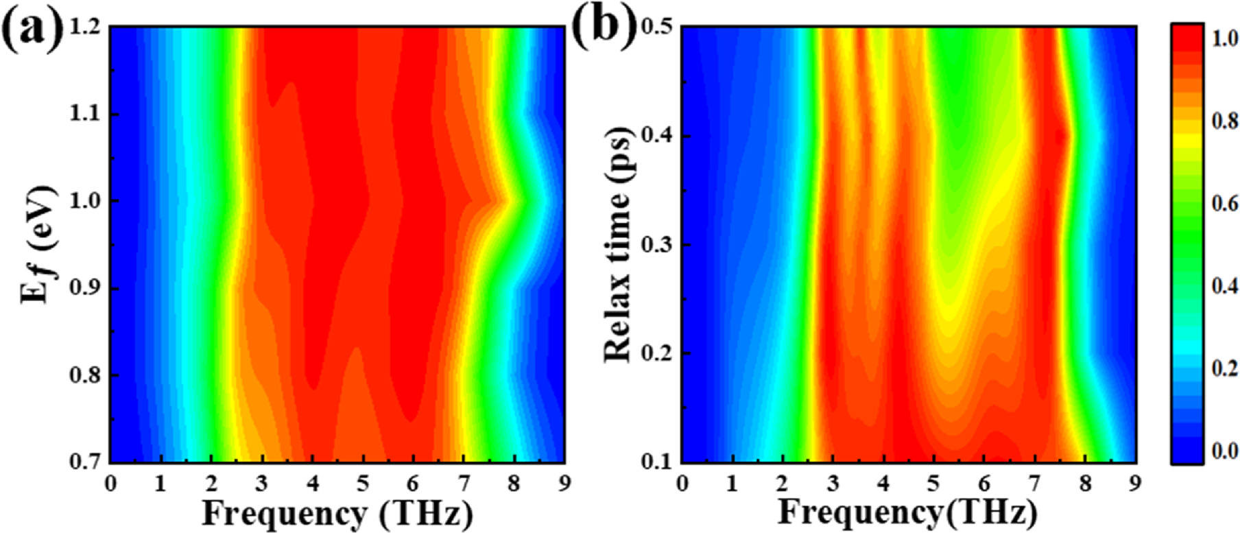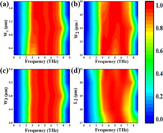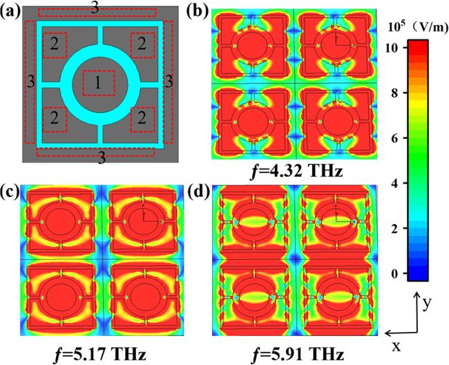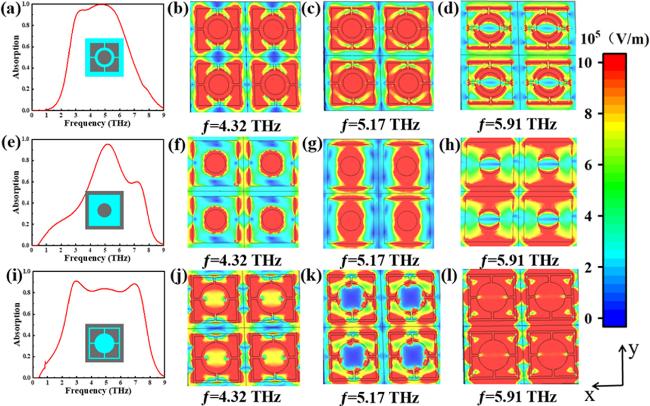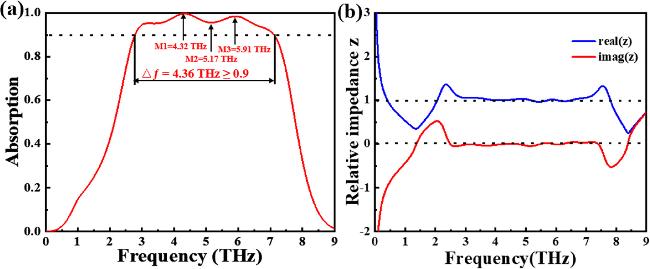 figure 1(a) presents a sandwich design. The metal layer can enhance the local electromagnetic field through the surface plasmon resonance phenomenon, and also enhance the reflection. The refractive index of the dielectric layer can affect the resonance frequency, optimize the light absorption, and it also helps to increase the bandwidth of the absorber. Graphene can work synergistically with metal layers to participate in the surface plasmon resonance phenomenon, further enhancing absorption. The bottom layer is a base layer made of gold, with a thickness of 0.5 μm, which effectively preventing the propagation of terahertz waves below the absorption layer. The intermediate layer is a silicon dioxide (SiO