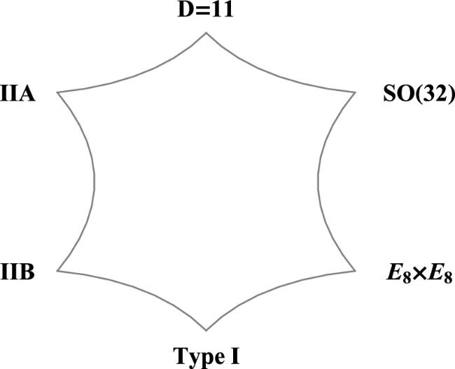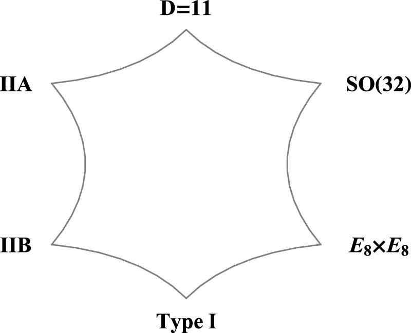 M-theory has a maximal 11-dimensional spacetime and unifies not only the five known 10-dimensional perturbative string theories but also the previously isolated 11-dimensional supergravity. These latter six theories appear as six different limits of the former at six different limits, as shown in figure 1.