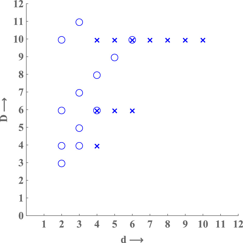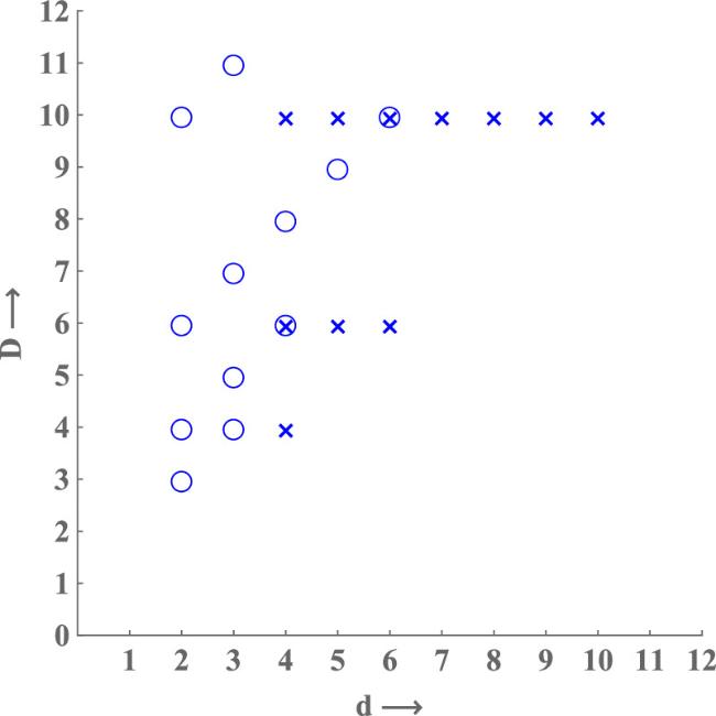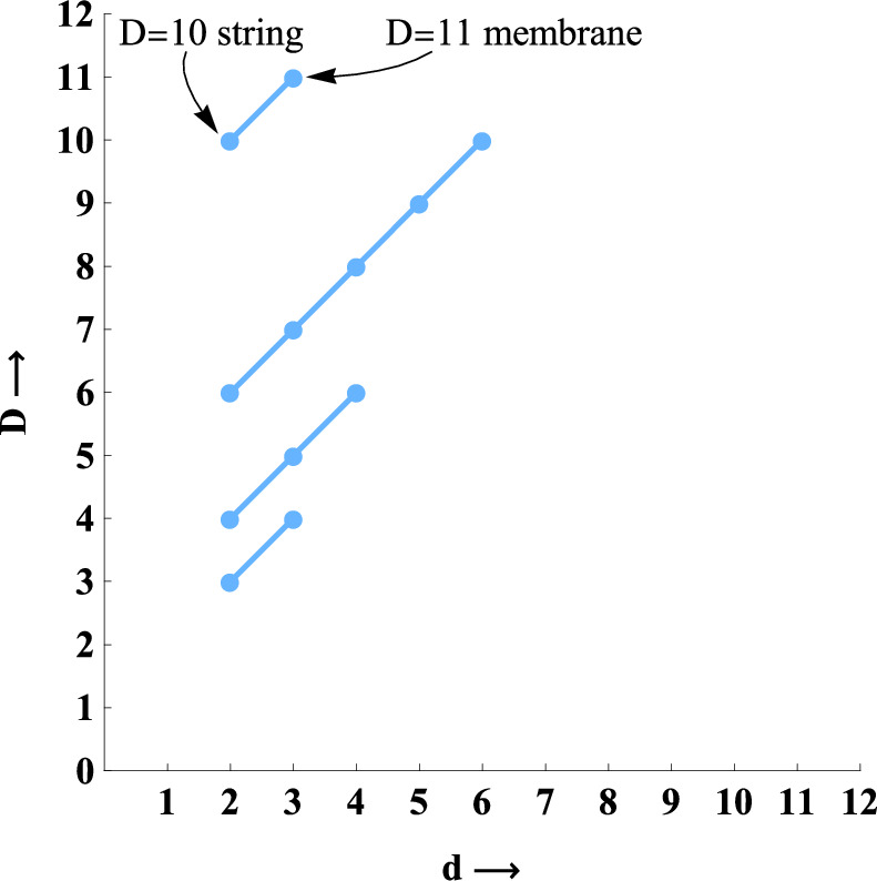 Figure 3. The new brane scan. All possible d ≥ 2 scalar supermultiplets, denoted by circles, and vector supermultiplets, denoted by crosses, according to D=d+ the number of scalars.
