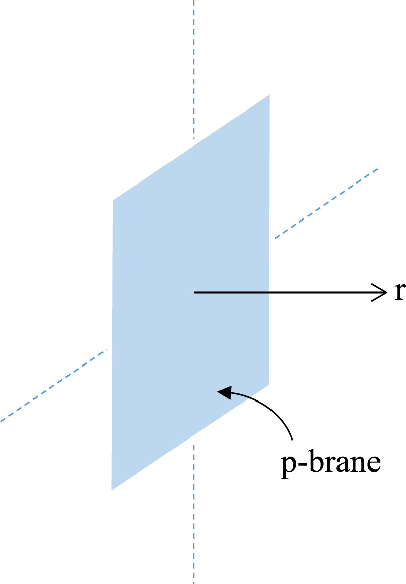 We are seeking a static and stable BPS configuration and this requires that the brane is infinitely extended along its p-spatial directions and the brane tension be equal to its charge density in certain units such that the attraction due to its tension can cancel the repulsion due to its charge density. Otherwise, it is impossible to balance the attraction against the repulsion and to give rise to a stable configuration. Picture-wise, this p-brane configuration is represented in figure 5.