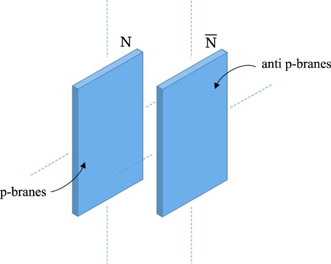 There is mounting evidence in support of this interpretation of these kinds of non-SUSY p-brane solutions (see figure 6). There is an attractive force acting between Np-branes and $\bar{N}$ anti-p-branes when they are placed parallel to each other. When their separation is on the order of string length ls, annihilation between the branes and the anti-branes begins to occur in reality. However, in the supergravity approximation, such an annihilation process will not manifest to the observer outside the event horizon and, instead, when the Np-branes and the $\bar{N}$ anti-p-branes are put on top of each other, the apparent spherical symmetry along the transverse directions will give rise to a static configuration due to Birkhoff's theorem.