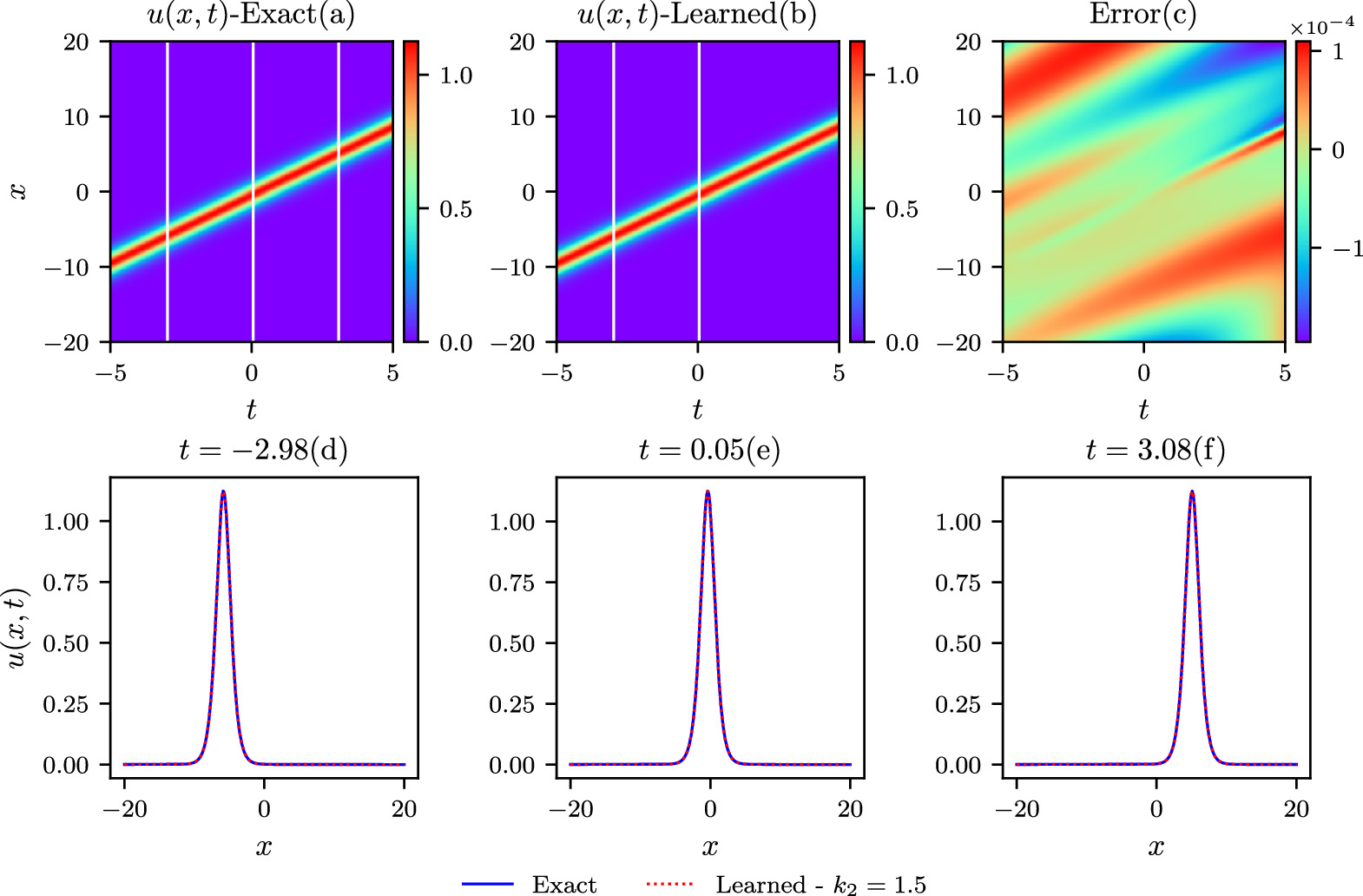 Figure 10. The comparisons of the exact and learned results are depicted similarly to those in the above figure 8, except that k = 1.5 in the chasing-soliton simulations.