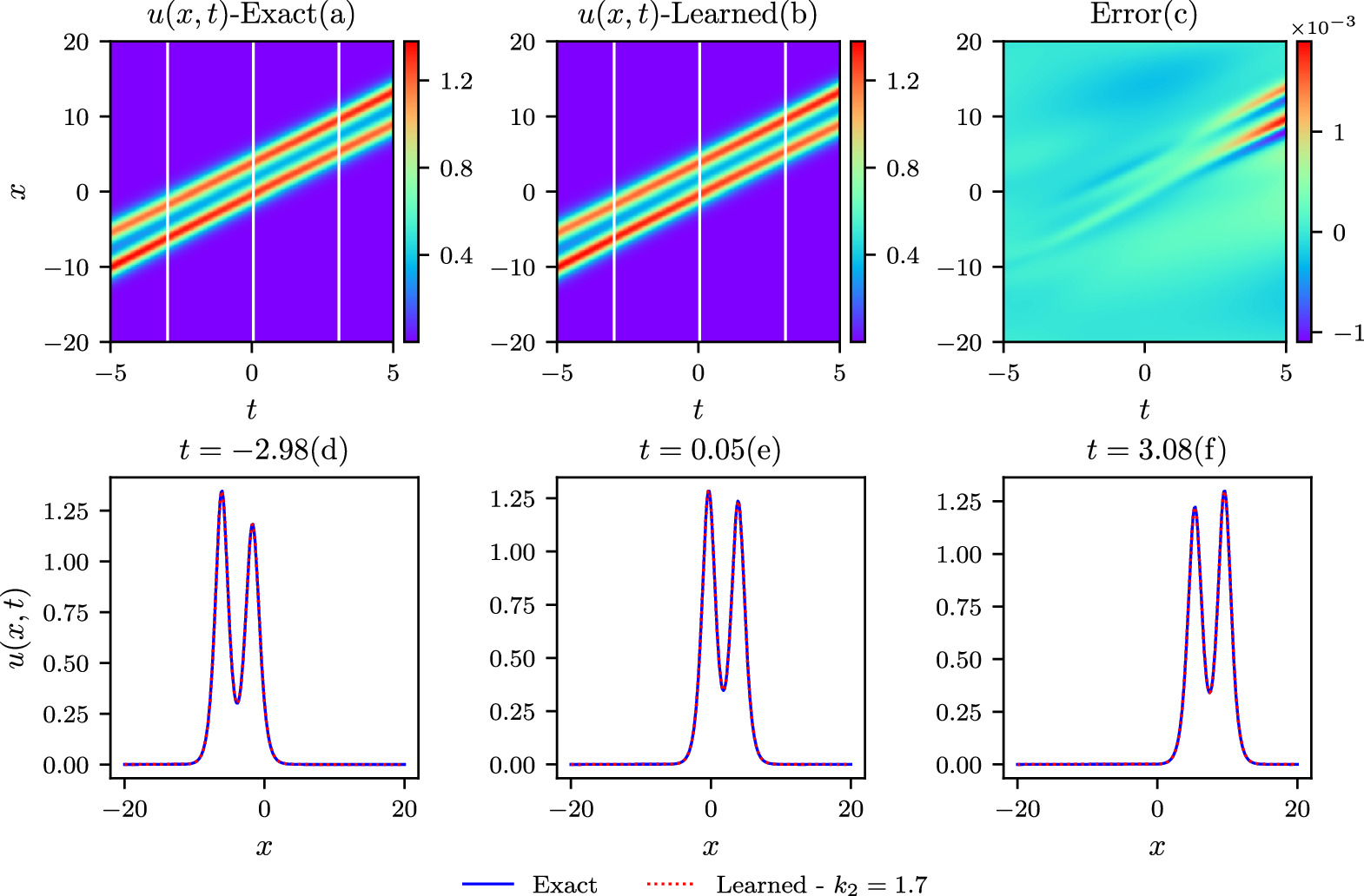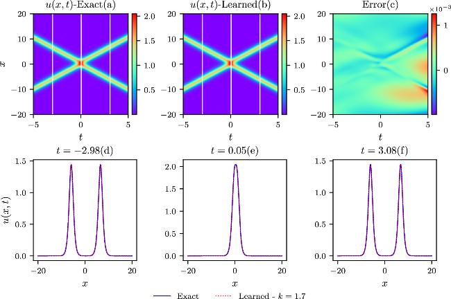 Figure 5. The comparisons of the exact and learned results are depicted similarly to those in the above figure 2, except that k = 1.7 in the colliding-soliton simulations.